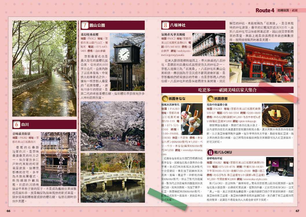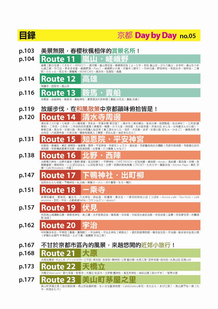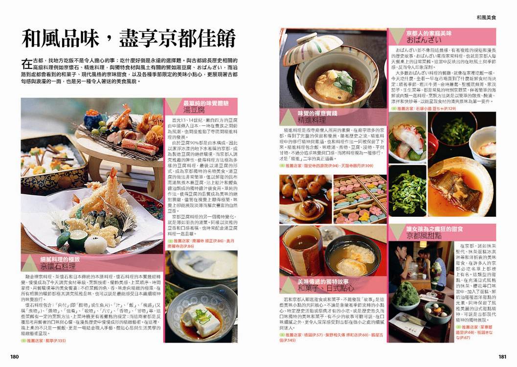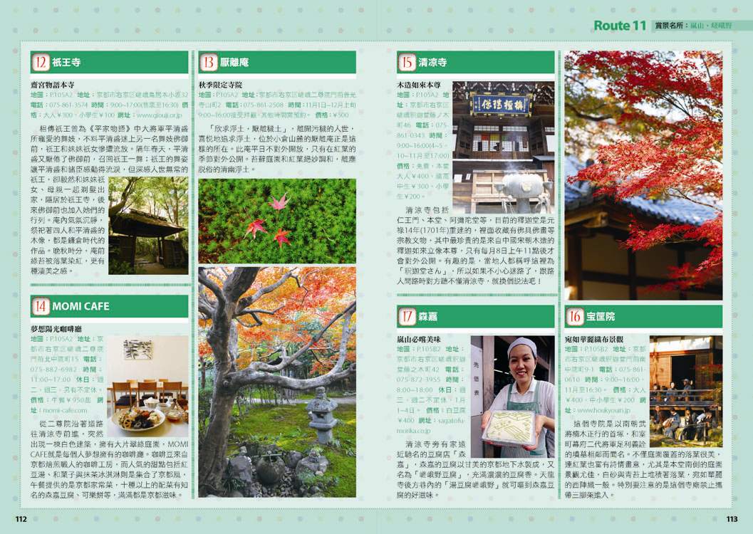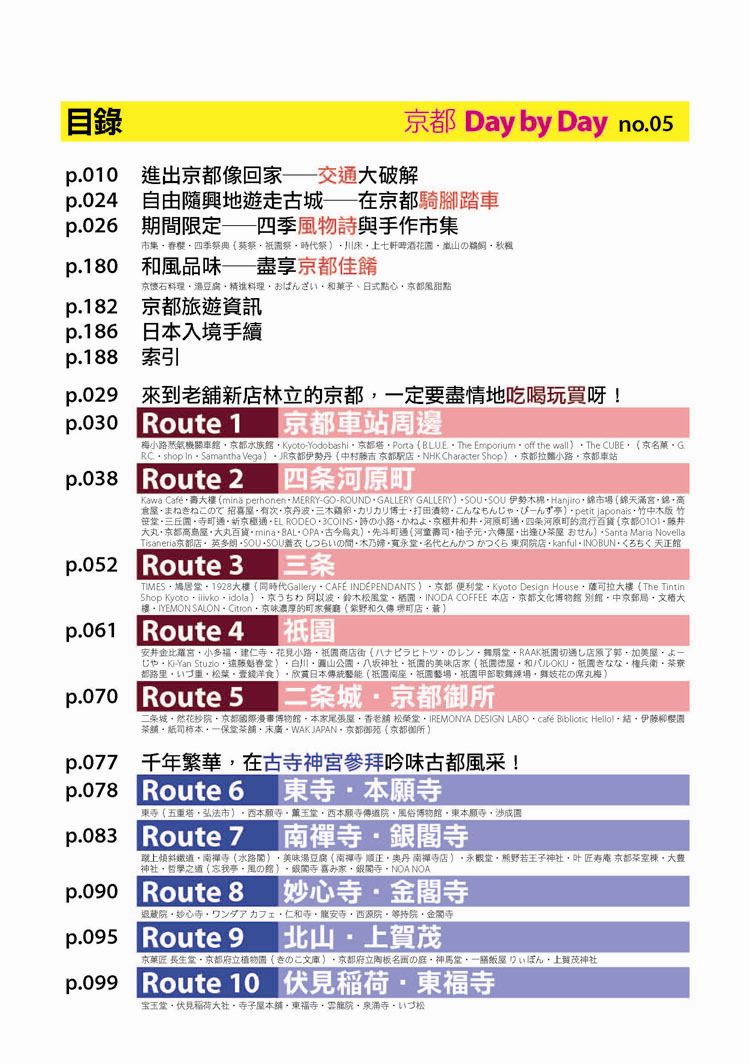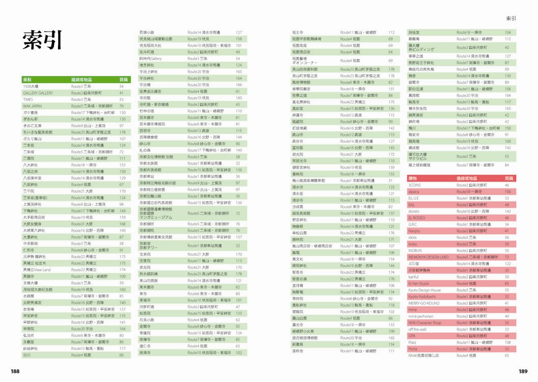 p.010 進出京都像回家──交通大破解 p.024 自由隨興地遊走古城──在京都騎腳踏車 p.026 期間限定──四季風物詩與手作市集 市集‧春櫻‧四季祭典(葵祭‧祇園祭‧時代祭)‧川床‧上七軒啤酒花園‧嵐山の鵜飼‧秋楓 p.180 和風品味──盡享京都佳餚 京懷石料理‧湯豆腐‧精進料理‧おばんざい‧和菓子、日式點心‧京都風甜點 p.182 京都旅遊資訊 p.186 日本入境手續 p.188 索引 p.029 來到老舖新店林立的京都,一定要盡情地吃喝玩買呀! p.030 Route 1 京都車站周邊 梅小路蒸氣機關車館‧京都水族館‧Kyoto-Yodobashi‧京都塔‧Porta(B.L.U.E.‧THE EMPORIUM‧off the wall)‧The CUBE‧(京名菓‧G.R.C.‧shop In‧Samantha Vega)‧JR京都伊勢丹(中村藤吉 京都車站店‧NHK Character Shop)‧京都拉麵小路‧京都車站 p.038 Route 2 四条河原町 Kawa Café‧壽大樓(minä perhonen‧MERRY-GO-ROUND‧GALLERY GALLERY)‧SOU・SOU 伊勢木棉‧Hanjiro‧錦市場(錦天滿宮‧錦‧高倉屋‧招喜屋‧有次‧京丹波‧三木鷄卵‧カリカリ博士‧打田漬物‧こんなもんじゃ‧びーんず亭)‧petit japonais‧竹中木版 竹笹堂‧三丘園‧寺町通‧新京極通‧EL RODEO‧3COINS‧詩の小路‧かねよ‧京極井和井‧河原町通‧四条河原町的流行百貨(京都O1O1‧藤井大丸‧京都高島屋‧大丸百貨‧mina‧BAL‧OPA‧古今烏丸)‧先斗町通(河童壽司‧柚子元‧六傳屋‧出逢ひ茶屋 おせん)‧Santa Maria Novella Tisaneria京都店‧ 英多朗‧SOU・SOU着衣 しつらいの間‧木乃婦‧寬永堂‧名代とんかつ かつくら 東洞院店‧kanful‧INOBUN‧くろちく 天正館 p.052 Route 3 三条 TIMES‧鳩居堂‧1928大樓(同時代Gallery‧CAFÉ INDÉPENDANTS)‧京都 便利堂‧Kyoto Design House‧薩可拉大樓(The Tintin Shop Kyoto‧iiivko‧idola)‧京うちわ 阿以波‧鈴木松風堂‧栖園‧INODA COFFEE 本店‧京都文化博物館 別館‧中京郵局‧文椿大樓‧IYEMON SALON‧Citron‧京味濃厚的町家餐廳(紫野和久傳 堺町店‧蒼) p.061 Route 4 祇園 安井金比羅宮‧小多福‧建仁寺‧花見小路‧祇園商店街(ハナビラヒトツ‧のレン‧舞扇堂‧RAAK祇園切通し店原了郭‧加美屋‧よーじや‧Ki-Yan Stuzio‧遠藤魁春堂)‧白川‧圓山公園‧八坂神社‧祇園的美味店家(祇園德屋‧和バルOKU‧祇園きなな‧権兵衛‧茶寮都路里‧いづ重‧松葉‧壹錢洋食)‧欣賞日本傳統藝能(祇園南座‧祇園藝場‧祇園甲部歌舞練場‧舞妓花の席丸梅) p.070 Route 5 二条城‧京都御所 二条城‧然花抄院‧京都國際漫畫博物館‧本家尾張屋‧香老舗 松榮堂‧IREMONYA DESIGN LABO‧café Bibliotic Hello!‧結‧伊藤柳櫻園茶舖‧紙司柿本‧一保堂茶舗‧末廣‧WAK JAPAN‧京都御苑(京都御所) p.077 千年繁華,在古寺神宮參拜吟味古都風采! p.078 Route 6 東寺‧本願寺 東寺(五重塔‧弘法市)‧西本願寺‧薫玉堂‧西本願寺傳道院‧風俗博物館‧東本願寺‧渉成園 p.083 Route 7 南禪寺‧銀閣寺 蹴上傾斜鐵道‧南禪寺(水路閣)‧美味湯豆腐(南禪寺 順正‧奥丹 南禪寺店)‧永觀堂‧熊野若王子神社‧叶 匠寿庵 京都茶室棟‧大豊神社‧哲學之道(忘我亭‧風の館)‧銀閣寺 喜み家‧銀閣寺‧NOA NOA p.090 Route 8 妙心寺‧金閣寺 退蔵院‧妙心寺‧ワンダア カフェ‧仁和寺‧龍安寺‧西源院‧等持院‧金閣寺 p.095 Route 9 北山‧上賀茂 京菓匠 長生堂‧京都府立植物園(きのこ文庫)‧京都府立陶板名画の庭‧神馬堂‧一膳飯屋 りぃぼん‧上賀茂神社 p.099 Route 10 伏見稲荷‧東福寺 宝玉堂‧伏見稲荷大社‧寺子屋本舖‧東福寺‧雲龍院‧泉涌寺‧いづ松 p.103 美景無限,春櫻秋楓相伴的賞景名所! p.104 Route 11 嵐山‧嵯峨野 嵐電(駅の足湯‧くろちく‧ARINCO)‧渡月橋‧嵐山商店街‧嵯峨商店街(よーじや‧老松 嵐山店‧ぶらり嵐山‧まゆ村‧嵐山ちりめん細工館‧竹乃店‧琴きき茶屋‧嵯峨野湯‧Platz)‧嵯峨野小火車‧天龍寺(篩月)‧竹林の道‧野宮神社‧常寂光寺‧落柿舎‧二尊院‧ふらっと‧祇王寺‧厭離庵‧MOMI CAFE‧清凉寺‧宝筐院‧森嘉 p.114 Route 12 高雄 神護寺‧西明寺‧高山寺 p.116 Route 13 鞍馬‧貴船 多聞堂‧由岐神社‧鞍馬寺‧貴船神社‧夏季限定川床料理(貴船 ひろ文‧貴船 兵衛) p.119 放緩步伐,在和風散策中京都韻味俯拾皆是! p.120 Route 14 清水寺周邊 清水坂(JIZO堂‧七味家‧八ッ橋茶屋‧京あみ‧京清水燒 朝日堂)‧清水寺(清水舞台‧音羽の滝‧夜間點燈‧地主神社)‧三年坂(產寧坂)‧二年坂‧三年坂‧二年坂的吃吃買買(青龍苑‧梅園‧カラス堂‧洲浜屋‧文の助茶屋‧洋食の店 みしな‧お地蔵さんの小路)‧寧寧之道‧高台寺‧石塀小路‧高台寺周邊人氣店家(箸工房おおした‧洛匠‧天空庵‧波ぎ‧石塀小路 豆ちゃ‧ひさご)‧鍵善良房 高台寺店‧八坂庚申堂‧八坂之塔‧變身和服美人(舞香‧ぎおん彩‧染匠きたむら) p.131 Route 15 知恩院‧平安神宮 知恩院‧青蓮院‧菓匠 清閑院‧無鄰菴‧瓢亭‧平安神宮‧京都生ショコラ‧真如堂‧京都藝術與文化體驗(京都市美術館‧京都國立近代美術館‧京都伝統産業ふれあい館‧細見美術館‧古香庵‧八つ橋庵 しゃなり) p.138 Route 16 北野‧西陣 大將軍八神社‧北野天滿宮(粟餅 澤屋‧長五郎餅)‧平野神社‧CAFÉ FROSCH‧釘拔地藏‧織成館‧dorato‧鳥岩樓‧冨田屋‧卯晴‧西陣織會館‧晴明神