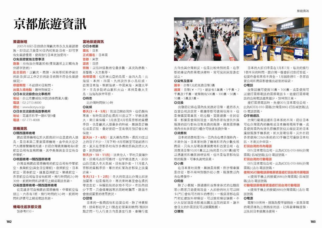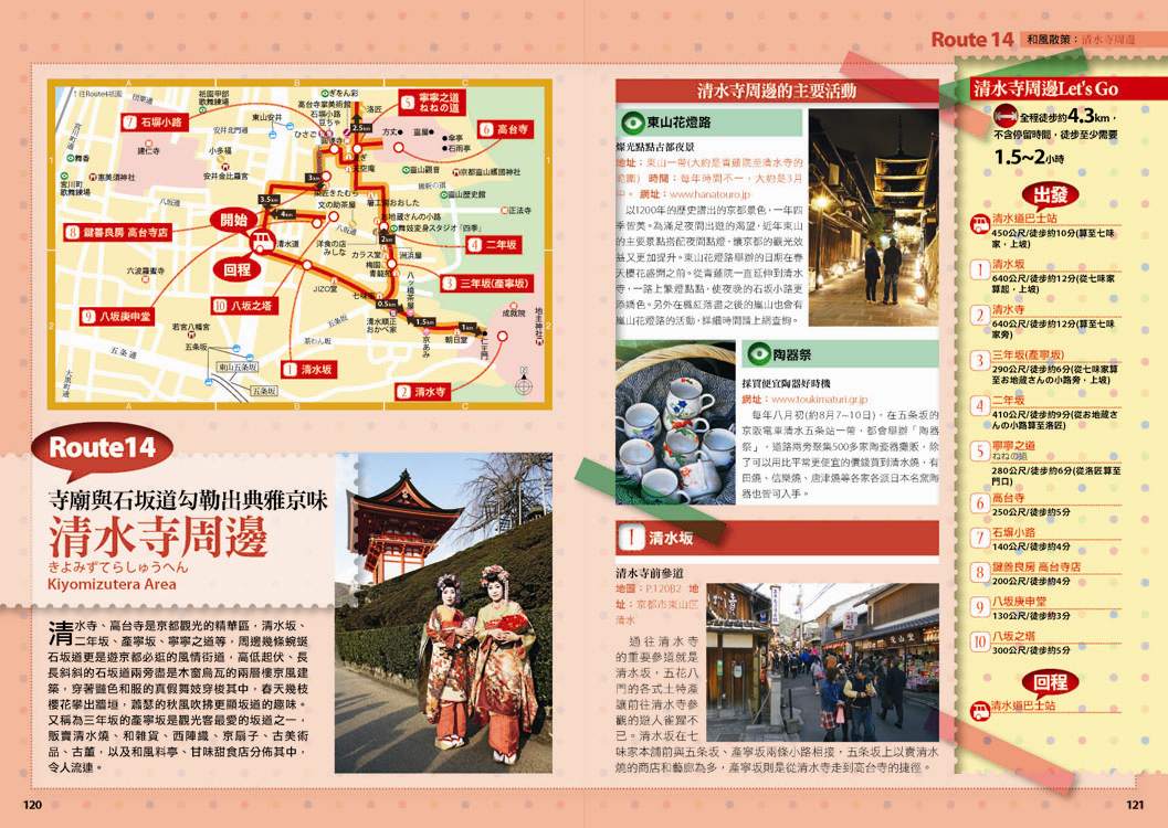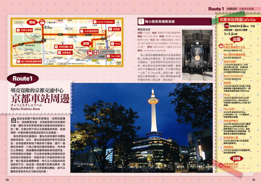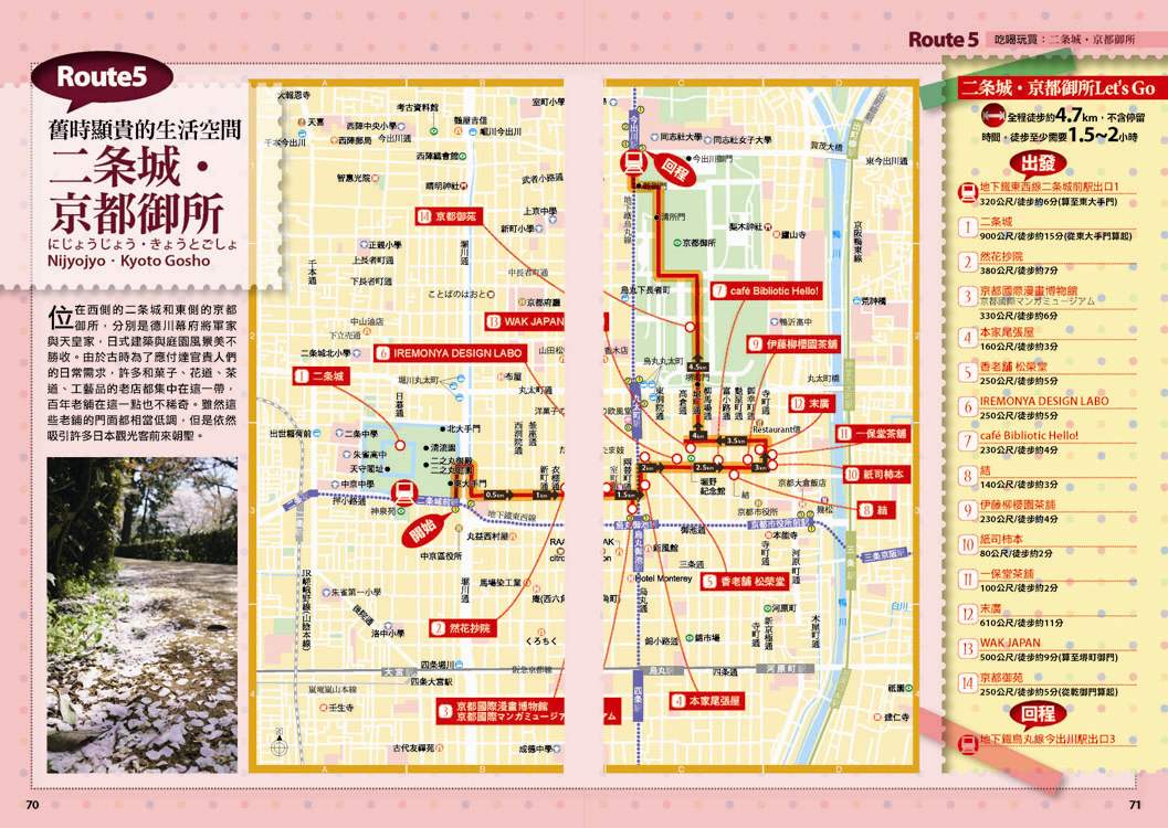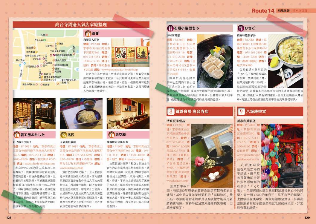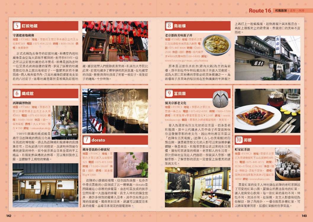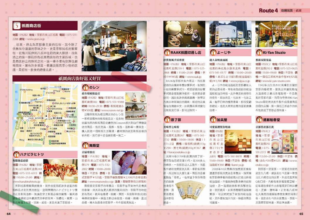p.010 進出京都像回家──交通大破解 p.024 自由隨興地遊走古城──在京都騎腳踏車 p.026 期間限定──四季風物詩與手作市集 市集‧春櫻‧四季祭典(葵祭‧祇園祭‧時代祭)‧川床‧上七軒啤酒花園‧嵐山の鵜飼‧秋楓 p.180 和風品味──盡享京都佳餚 京懷石料理‧湯豆腐‧精進料理‧おばんざい‧和菓子、日式點心‧京都風甜點 p.182 京都旅遊資訊 p.186 日本入境手續 p.188 索引 p.029 來到老舖新店林立的京都,一定要盡情地吃喝玩買呀! p.030 Route 1 京都車站周邊 梅小路蒸氣機關車館‧京都水族館‧Kyoto-Yodobashi‧京都塔‧Porta(B.L.U.E.‧THE EMPORIUM‧off the wall)‧The CUBE‧(京名菓‧G.R.C.‧shop In‧Samantha Vega)‧JR京都伊勢丹(中村藤吉 京都車站店‧NHK Character Shop)‧京都拉麵小路‧京都車站 p.038 Route 2 四条河原町 Kawa Café‧壽大樓(minä perhonen‧MERRY-GO-ROUND‧GALLERY GALLERY)‧SOU・SOU 伊勢木棉‧Hanjiro‧錦市場(錦天滿宮‧錦‧高倉屋‧招喜屋‧有次‧京丹波‧三木鷄卵‧カリカリ博士‧打田漬物‧こんなもんじゃ‧びーんず亭)‧petit japonais‧竹中木版 竹笹堂‧三丘園‧寺町通‧新京極通‧EL RODEO‧3COINS‧詩の小路‧かねよ‧京極井和井‧河原町通‧四条河原町的流行百貨(京都O1O1‧藤井大丸‧京都高島屋‧大丸百貨‧mina‧BAL‧OPA‧古今烏丸)‧先斗町通(河童壽司‧柚子元‧六傳屋‧出逢ひ茶屋 おせん)‧Santa Maria Novella Tisaneria京都店‧ 英多朗‧SOU・SOU着衣 しつらいの間‧木乃婦‧寬永堂‧名代とんかつ かつくら 東洞院店‧kanful‧INOBUN‧くろちく 天正館 p.052 Route 3 三条 TIMES‧鳩居堂‧1928大樓(同時代Gallery‧CAFÉ INDÉPENDANTS)‧京都 便利堂‧Kyoto Design House‧薩可拉大樓(The Tintin Shop Kyoto‧iiivko‧idola)‧京うちわ 阿以波‧鈴木松風堂‧栖園‧INODA COFFEE 本店‧京都文化博物館 別館‧中京郵局‧文椿大樓‧IYEMON SALON‧Citron‧京味濃厚的町家餐廳(紫野和久傳 堺町店‧蒼) p.061 Route 4 祇園 安井金比羅宮‧小多福‧建仁寺‧花見小路‧祇園商店街(ハナビラヒトツ‧のレン‧舞扇堂‧RAAK祇園切通し店原了郭‧加美屋‧よーじや‧Ki-Yan Stuzio‧遠藤魁春堂)‧白川‧圓山公園‧八坂神社‧祇園的美味店家(祇園德屋‧和バルOKU‧祇園きなな‧権兵衛‧茶寮都路里‧いづ重‧松葉‧壹錢洋食)‧欣賞日本傳統藝能(祇園南座‧祇園藝場‧祇園甲部歌舞練場‧舞妓花の席丸梅) p.070 Route 5 二条城‧京都御所 二条城‧然花抄院‧京都國際漫畫博物館‧本家尾張屋‧香老舗 松榮堂‧IREMONYA DESIGN LABO‧café Bibliotic Hello!‧結‧伊藤柳櫻園茶舖‧紙司柿本‧一保堂茶舗‧末廣‧WAK JAPAN‧京都御苑(京都御所) p.077 千年繁華,在古寺神宮參拜吟味古都風采! p.078 Route 6 東寺‧本願寺 東寺(五重塔‧弘法市)‧西本願寺‧薫玉堂‧西本願寺傳道院‧風俗博物館‧東本願寺‧渉成園 p.083 Route 7 南禪寺‧銀閣寺 蹴上傾斜鐵道‧南禪寺(水路閣)‧美味湯豆腐(南禪寺 順正‧奥丹 南禪寺店)‧永觀堂‧熊野若王子神社‧叶 匠寿庵 京都茶室棟‧大豊神社‧哲學之道(忘我亭‧風の館)‧銀閣寺 喜み家‧銀閣寺‧NOA NOA p.090 Route 8 妙心寺‧金閣寺 退蔵院‧妙心寺‧ワンダア カフェ‧仁和寺‧龍安寺‧西源院‧等持院‧金閣寺 p.095 Route 9 北山‧上賀茂 京菓匠 長生堂‧京都府立植物園(きのこ文庫)‧京都府立陶板名画の庭‧神馬堂‧一膳飯屋 りぃぼん‧上賀茂神社 p.099 Route 10 伏見稲荷‧東福寺 宝玉堂‧伏見稲荷大社‧寺子屋本舖‧東福寺‧雲龍院‧泉涌寺‧いづ松 p.103 美景無限,春櫻秋楓相伴的賞景名所! p.104 Route 11 嵐山‧嵯峨野 嵐電(駅の足湯‧くろちく‧ARINCO)‧渡月橋‧嵐山商店街‧嵯峨商店街(よーじや‧老松 嵐山店‧ぶらり嵐山‧まゆ村‧嵐山ちりめん細工館‧竹乃店‧琴きき茶屋‧嵯峨野湯‧Platz)‧嵯峨野小火車‧天龍寺(篩月)‧竹林の道‧野宮神社‧常寂光寺‧落柿舎‧二尊院‧ふらっと‧祇王寺‧厭離庵‧MOMI CAFE‧清凉寺‧宝筐院‧森嘉 p.114 Route 12 高雄 神護寺‧西明寺‧高山寺 p.116 Route 13 鞍馬‧貴船 多聞堂‧由岐神社‧鞍馬寺‧貴船神社‧夏季限定川床料理(貴船 ひろ文‧貴船 兵衛) p.119 放緩步伐,在和風散策中京都韻味俯拾皆是! p.120 Route 14 清水寺周邊 清水坂(JIZO堂‧七味家‧八ッ橋茶屋‧京あみ‧京清水燒 朝日堂)‧清水寺(清水舞台‧音羽の滝‧夜間點燈‧地主神社)‧三年坂(產寧坂)‧二年坂‧三年坂‧二年坂的吃吃買買(青龍苑‧梅園‧カラス堂‧洲浜屋‧文の助茶屋‧洋食の店 みしな‧お地蔵さんの小路)‧寧寧之道‧高台寺‧石塀小路‧高台寺周邊人氣店家(箸工房おおした‧洛匠‧天空庵‧波ぎ‧石塀小路 豆ちゃ‧ひさご)‧鍵善良房 高台寺店‧八坂庚申堂‧八坂之塔‧變身和服美人(舞香‧ぎおん彩‧染匠きたむら) p.131 Route 15 知恩院‧平安神宮 知恩院‧青蓮院‧菓匠 清閑院‧無鄰菴‧瓢亭‧平安神宮‧京都生ショコラ‧真如堂‧京都藝術與文化體驗(京都市美術館‧京都國立近代美術館‧京都伝統産業ふれあい館‧細見美術館‧古香庵‧八つ橋庵 しゃなり) p.138 Route 16 北野‧西陣 大將軍八神社‧北野天滿宮(粟餅 澤屋‧長五郎餅)‧平野神社‧CAFÉ FROSCH‧釘拔地藏‧織成館‧dorato‧鳥岩樓‧冨田屋‧卯晴‧西陣織會館‧晴明神