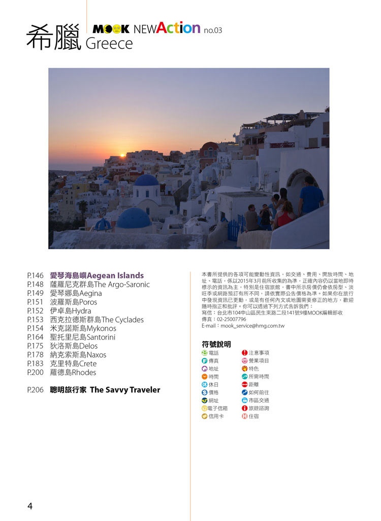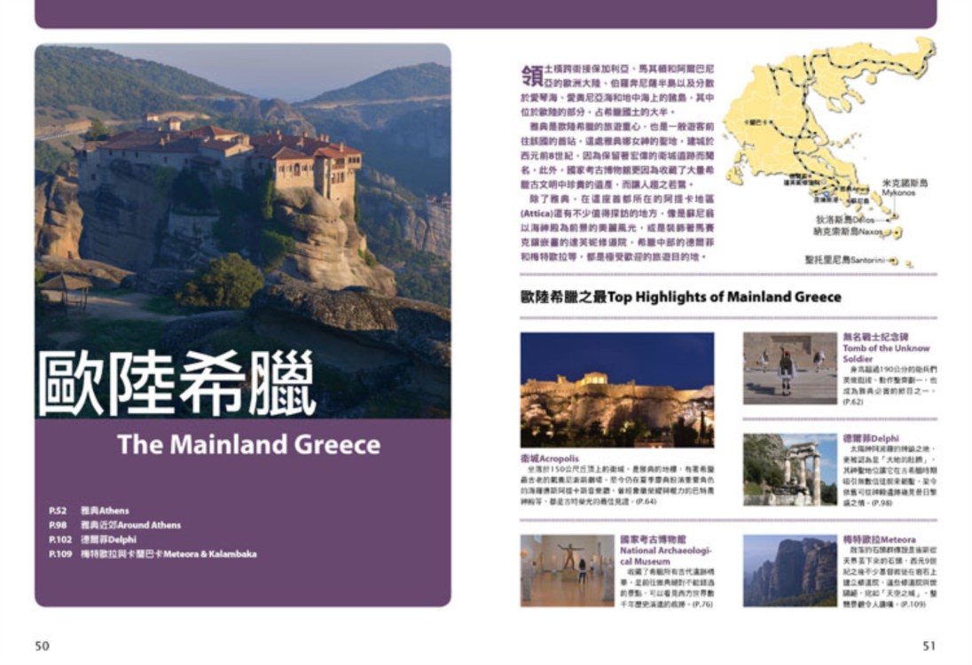 位於歐洲巴爾幹半島最南端的希臘,地處愛琴海、愛奧尼亞海和地中海的交界,早在西元前2200年,就在今日的克里特島上出現了米諾斯文明,它和後來將發展轉移到希臘本島的邁錫尼文明,形成歐洲最早的兩大文明,也因此使得希臘獲得「歐洲文明發源地」的美譽。 浪漫而又想像力豐富的古希臘人,不但創造出充滿人性的奧林匹斯諸神,也影響後世的羅馬人乃至於整個歐洲,迷人的神明與神話傳頌至今;到了西元前8世紀時走出另一個格局,不但誕生了西方文學中最早的史詩--荷馬史詩,更出現了蘇格拉底、柏拉圖、亞理斯多德等至今對西方思想影響深遠的哲學家。 古希臘人在地中海沿岸建立殖民地,發展出希臘城邦「波利斯」(Polis),衍生出今日的「政治」等名詞;雅典衛城、古科林斯、奧林匹克遺址……一處處歷史悠久的宏偉遺跡,不但成為古文明送給今人的最佳遺產,更是成千上萬名遊客爭相探訪的熱門景點。 除了探索文化之外,愛琴海的自然風光更是吸睛:海天一色的湛藍,美得令人屏息,點綴其中、散居島嶼上的白色房舍,成了體驗當地人悠閒生活的最佳落腳處,無論是3~7天的遊輪之旅,或是居遊於某個悠遠的小島,都是體驗希臘人浪漫風情的好選擇。 梅特歐拉是個神奇的地方,散落的石頭群傳說是憤怒的宙斯從天界丟下來的石頭,西元9世紀之後不少基督教徒們為了躲避宗教壓迫,紛紛逃到這裡來;也不可思議地嘗試在岩石之上建立修道院,這些修道院與世隔絕,宛如「天空之城」,整體景觀令人讚嘆。 新版的希臘,首先藉著當地的歷史、地理氣候、美食、特產、世界遺產及神話故事等主題,讓大家對這個西方文明的發源國度有概略的認識,接著再分別就歐陸本島、伯羅奔尼薩半島、愛琴海諸島等3大部分,詳細介紹,有助讀者融會貫通,日後規劃一趟最適合自己的希臘之旅。