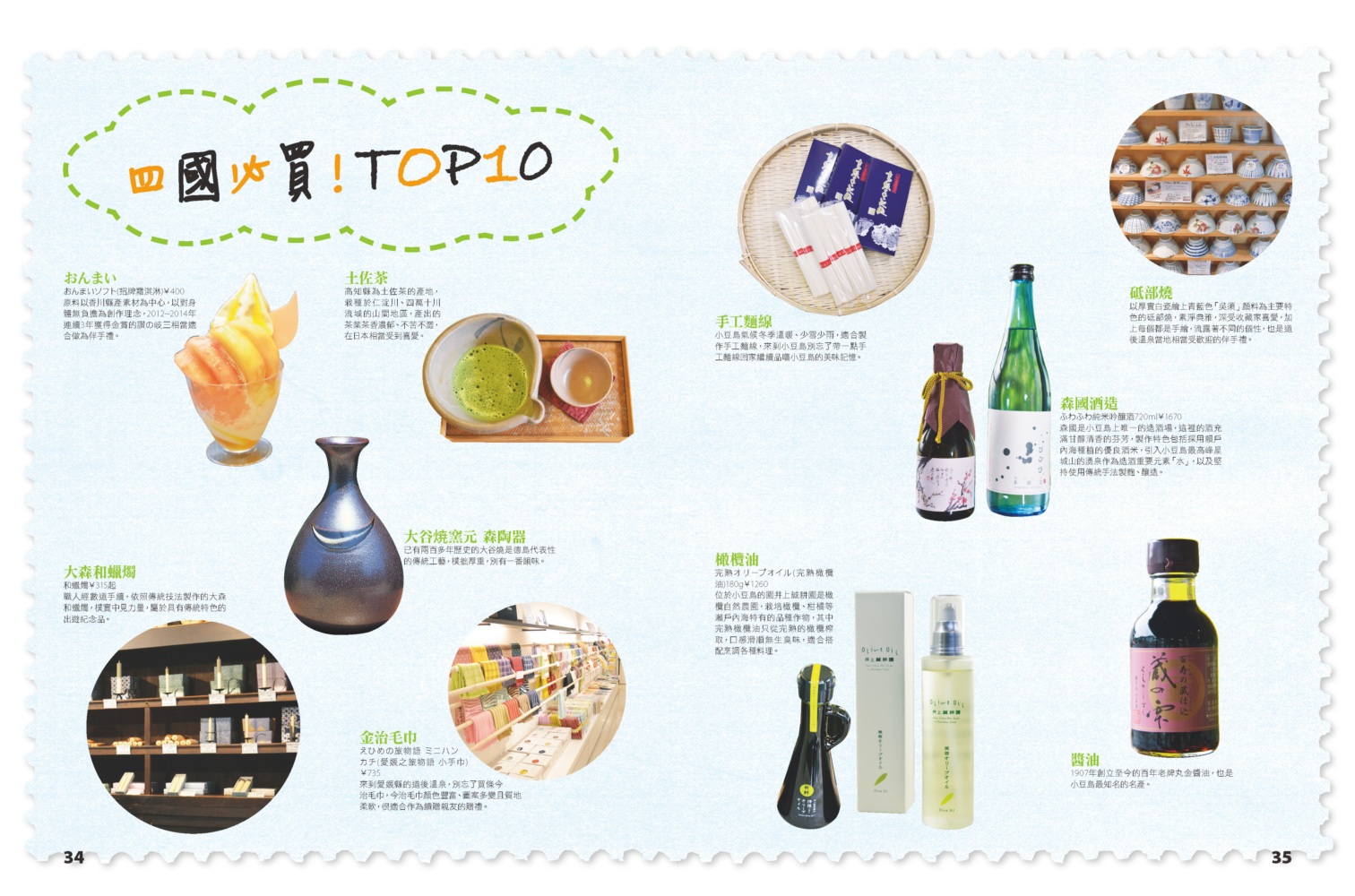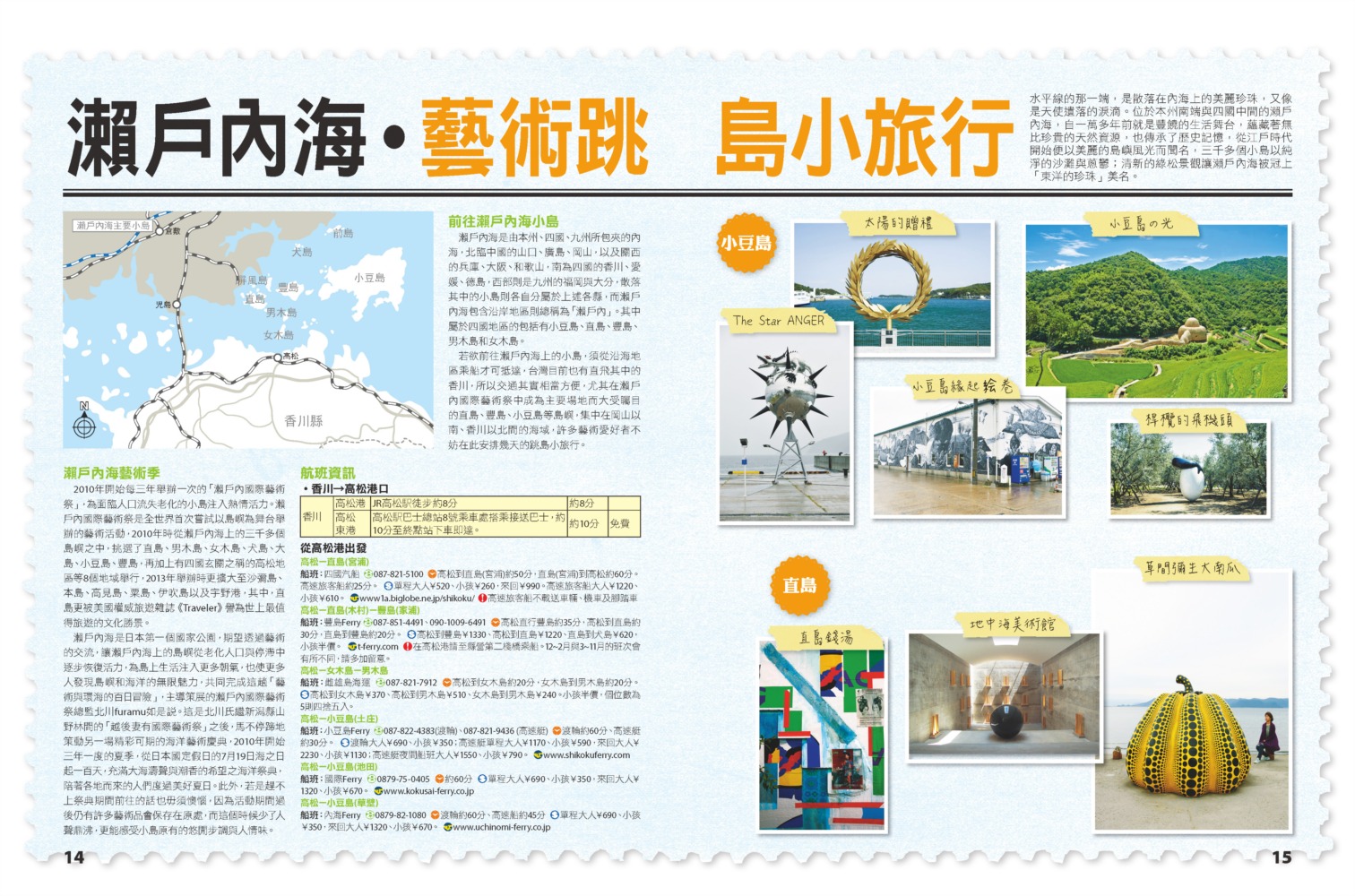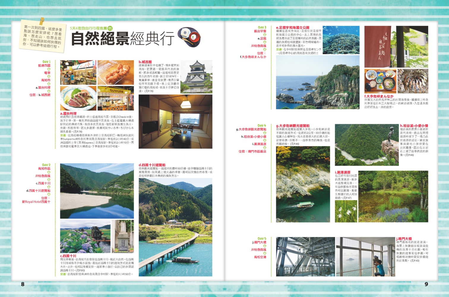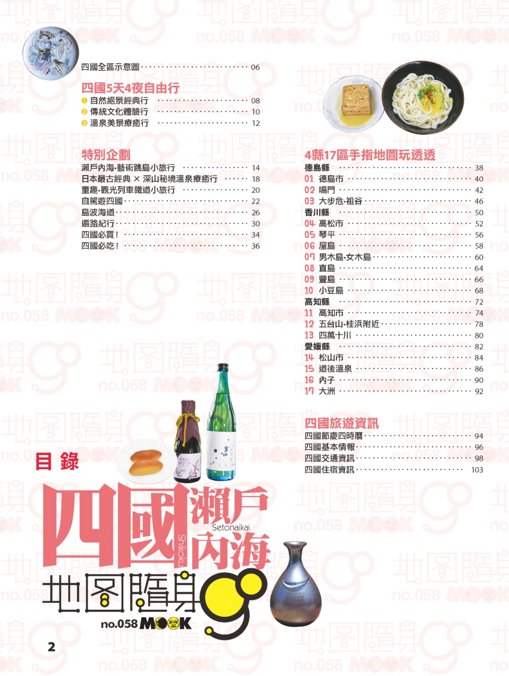 ◎目錄 【5天4夜自由行】 1. 自然絕景經典行 2. 傳統文化體驗行 3. 溫泉美景療癒行 【特企】 瀨戶內海藝術跳島小旅行 溫泉秘境 童趣‧美景觀光列車 自駕遊 島波海道單車小旅行 自我追尋的遍路紀行之旅 四國必買!TOP 15 四國必吃!TOP 15 【4縣34區手指MAP玩透透】 德島縣 德島市 鳴門 大步危•祖谷 香川縣 高松市 琴平 屋島 男木島•女木島 直島 豐島 小豆島 高知縣 高知市 五台山•桂浜附近 四萬十川 愛媛縣 松山市 道後溫泉 內子 大洲 節慶四時曆 交通資訊+住宿情報