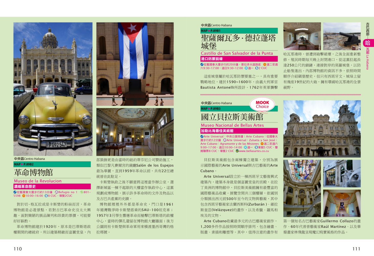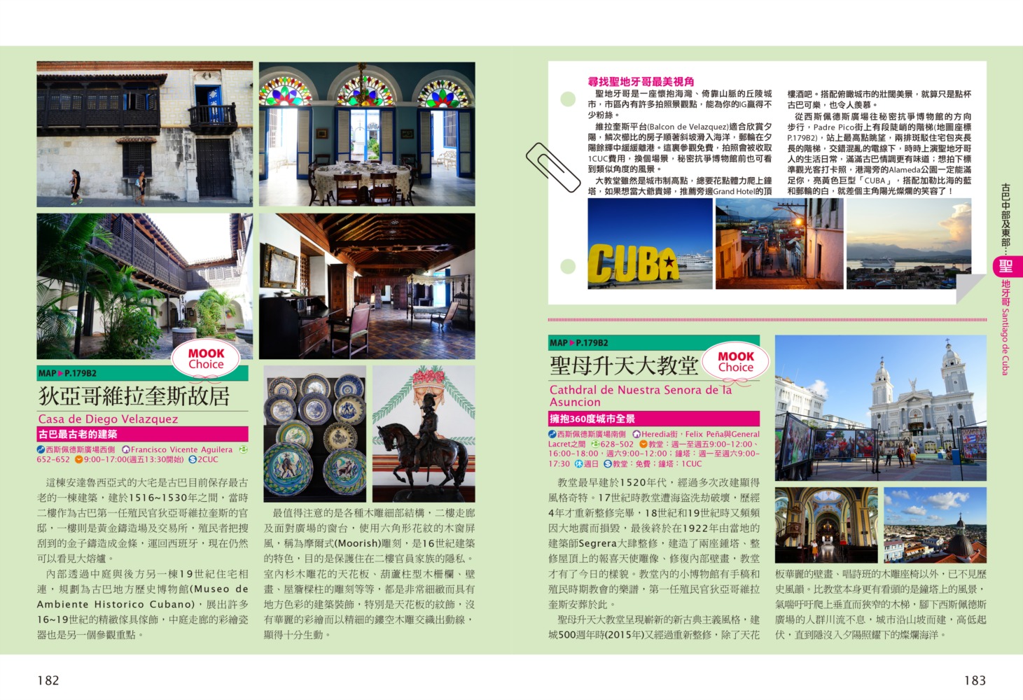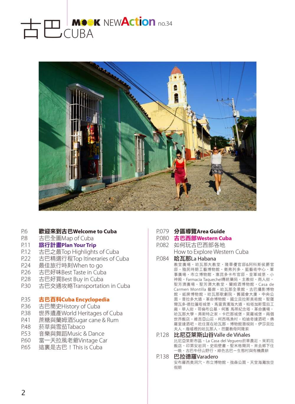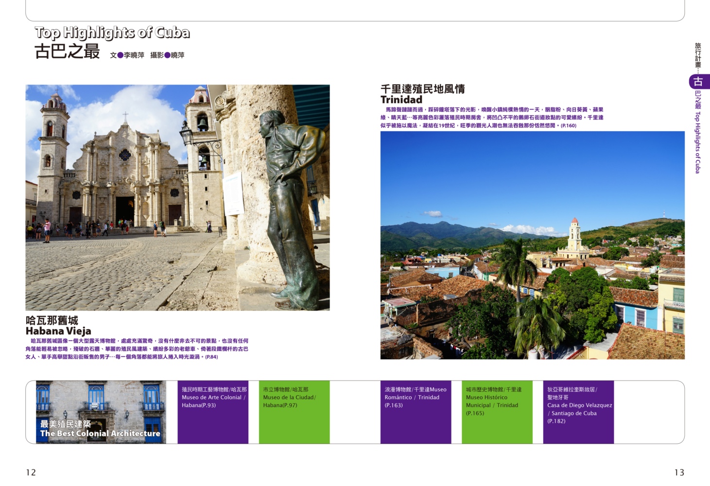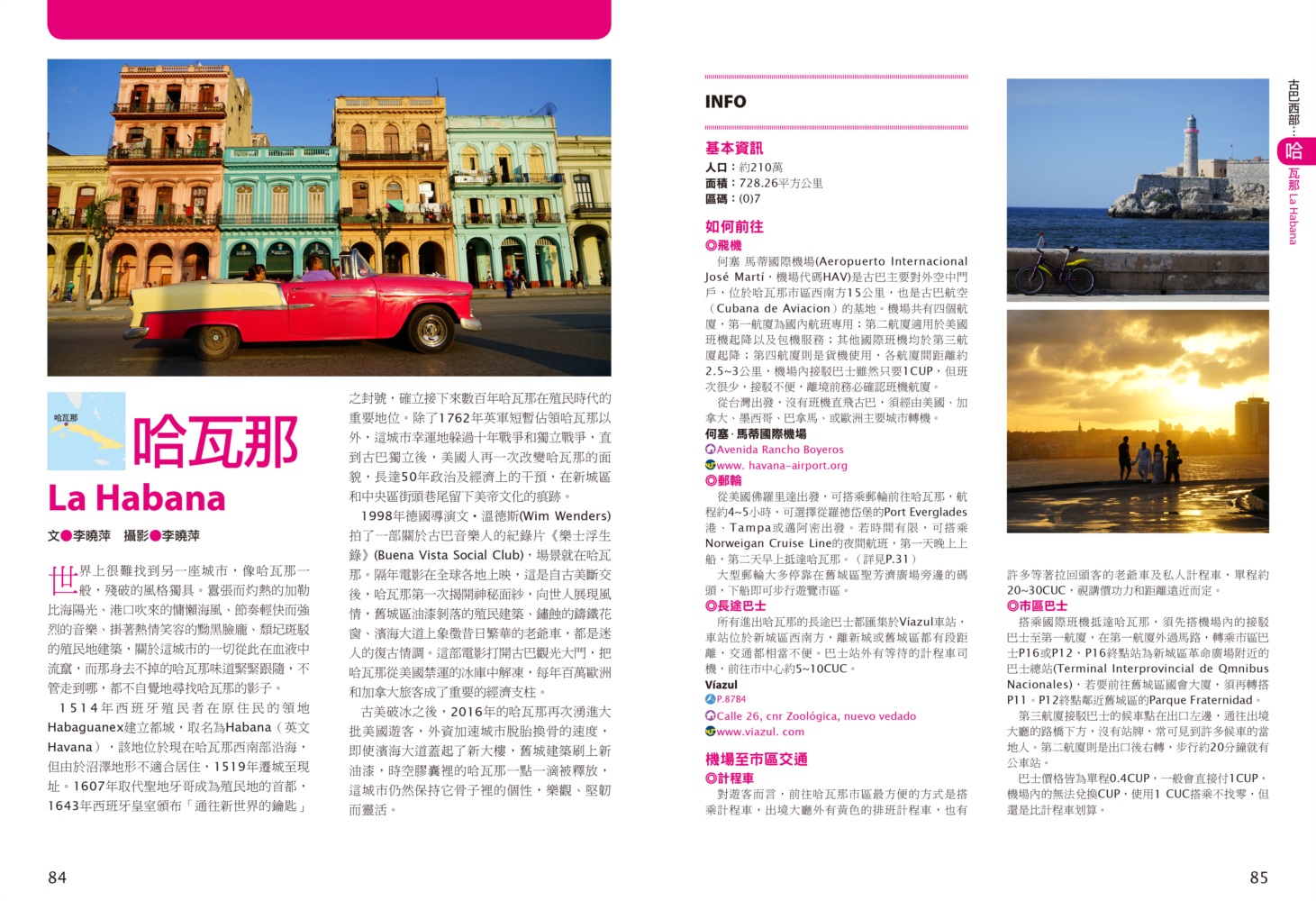 P.006 歡迎來到古巴Welcome to Cuba P.008 古巴全圖Map of Cuba P.011 旅行計畫Plan Your Trip P.012 古巴之最Top Highlights of Cuba P.022 古巴精選行程Top Itineraries of Cuba P.024 最佳旅行時刻When to go P.026 古巴好味Best Taste in Cuba P.028 古巴好買Best Buy in Cuba P.030 古巴交通攻略Transportation in Cuba P.035 古巴百科Cuba Encyclopedia P.036 古巴簡史History of Cuba P.038 世界遺產World Heritages of Cuba P.041 蔗糖與蘭姆酒Sugar cane & Rum P.048 菸草與雪茄Tabaco P.053 音樂與舞蹈Music & Dance P.060 當一天拉風老爺Vintage Car P.065 這裏是古巴!This is Cuba P.079 分區導覽Area Guide P.080 古巴西部Western Cuba P.082 如何玩古巴西部各地How to Explore Western Cuba P.084 哈瓦那La Habana 教堂廣場、哈瓦那大教堂、隆畢優官邸&阿科斯侯爵官邸、殖民時期工藝博物館、衛弗列多‧藍藝術中心、軍事廣場、市立博物館、塞昆多卡布官邸、皇軍城堡、小神殿、Farmacia Taquechel傳統藥局、主教街、商人街、聖芳濟廣場、聖芳濟大教堂、蘭姆酒博物館、Casa de Carmen Montilla 藝廊、哈瓦那全景館、古巴攝影博物館、紙牌博物館、哈瓦那歌劇院、舊國會大廈、中央公園、普拉多大道、革命博物館、國立貝拉斯美術館、聖薩爾瓦多·德拉蓬塔城堡、馬雷貢濱海大道、帕塔加斯雪茄工廠、華人街、哥倫布公墓、何塞・馬蒂紀念塔、革命廣場、哈瓦那大學、弗斯特之家、卡巴那城堡、莫羅城堡、兩個世界飯店、維吉亞山莊、柯西瑪漁村、柏迪奇達酒吧、佛羅里達酒吧、吃住買在哈瓦那、博物館潛規則、伊莎貝拉夫人、廢墟裡的哈瓦那人、芭蕾教母阿隆索 P.123 比尼亞萊斯山谷Valle de Viñales 比尼亞萊斯市區、La Casa del Veguero菸草農莊、茉莉花飯店、印第安岩洞、史前壁畫、聖米格爾洞、來去鄉下住一晚、古巴牛仔山野行、綠色古巴-生態村與有機農耕P.132 巴拉德羅Varadero 安布羅西奧洞穴、市立博物館、強森公園、天堂海灘放空假期P.136 馬坦薩斯Matanzas 自由公園、加西亞鐵橋與維希亞廣場、聖卡洛斯保羅麥歐大教堂、消防博物館、蒙賽拉特教堂 P.140 古巴中部及東部Central and Eastern Cuba P.142 如何玩古巴中部及東部各地How to Explore Western Cuba P.144 聖克拉拉Santa Clara 切・格瓦拉紀念碑、維達爾公園、仁慈劇院、裝飾藝術博物館、城市之家、康士坦丁諾菸草工廠、革命主題咖啡館、裝甲火車紀念公園、卡比羅山丘 P.150 西恩富戈斯Cienfuegos 何塞‧馬蒂公園、托馬斯特里劇院、文化之家、巴列宮 P.154 千里達Trinidad 主廣場、音樂之家、浪漫博物館、殖民建築博物館、城市歷史博物館、聖德利亞儀式之屋、戰爭博物館、陶器工作坊、甘蔗谷的繁榮與黑暗、Canchánchara、細讀殖民風建築、鼓聲與吟唱、千里達好味 P.165 卡馬圭 Camagüey 阿格拉蒙特之家、城市模型館、多元文化博物館、卡門廣場、聖胡安狄奧斯廣場、水缸之城、廣場與藝術 P.170 聖地牙哥Santiago de Cuba 狄亞哥維拉奎斯故居、西斯佩德斯廣場、聖母升天大教堂、詩歌之家、嘉年華博物館、荷西馬利之家、依莎貝利卡咖啡館、蘭姆酒博物館、百加得博物館、秘密抗爭博物館、蒙卡達軍營、聖伊菲熱尼亞墓園、莫羅城堡、山丘上的黑色聖女、尋找聖地牙哥最美視角、樂士浮生錄與不朽樂手、王者與蝙蝠的蘭姆酒、關達那美拉 P.184 巴拉柯阿Baracoa 可可之家、考古博物館、亞松森聖母大教堂、亞歷杭德羅‧德洪堡國家公園、巴拉科阿戶外旅程 P.188 聰明旅行家The Savvy Traveler