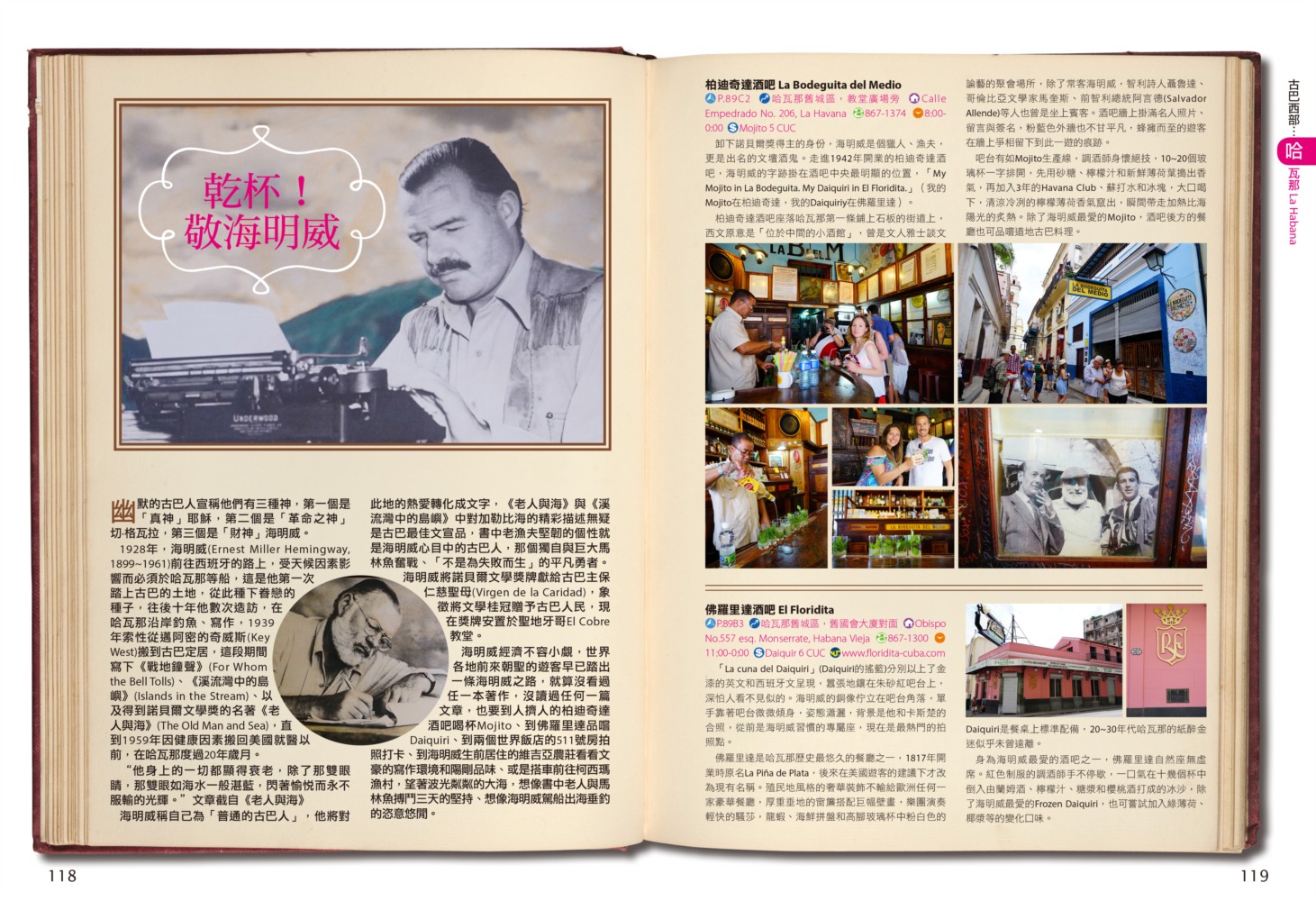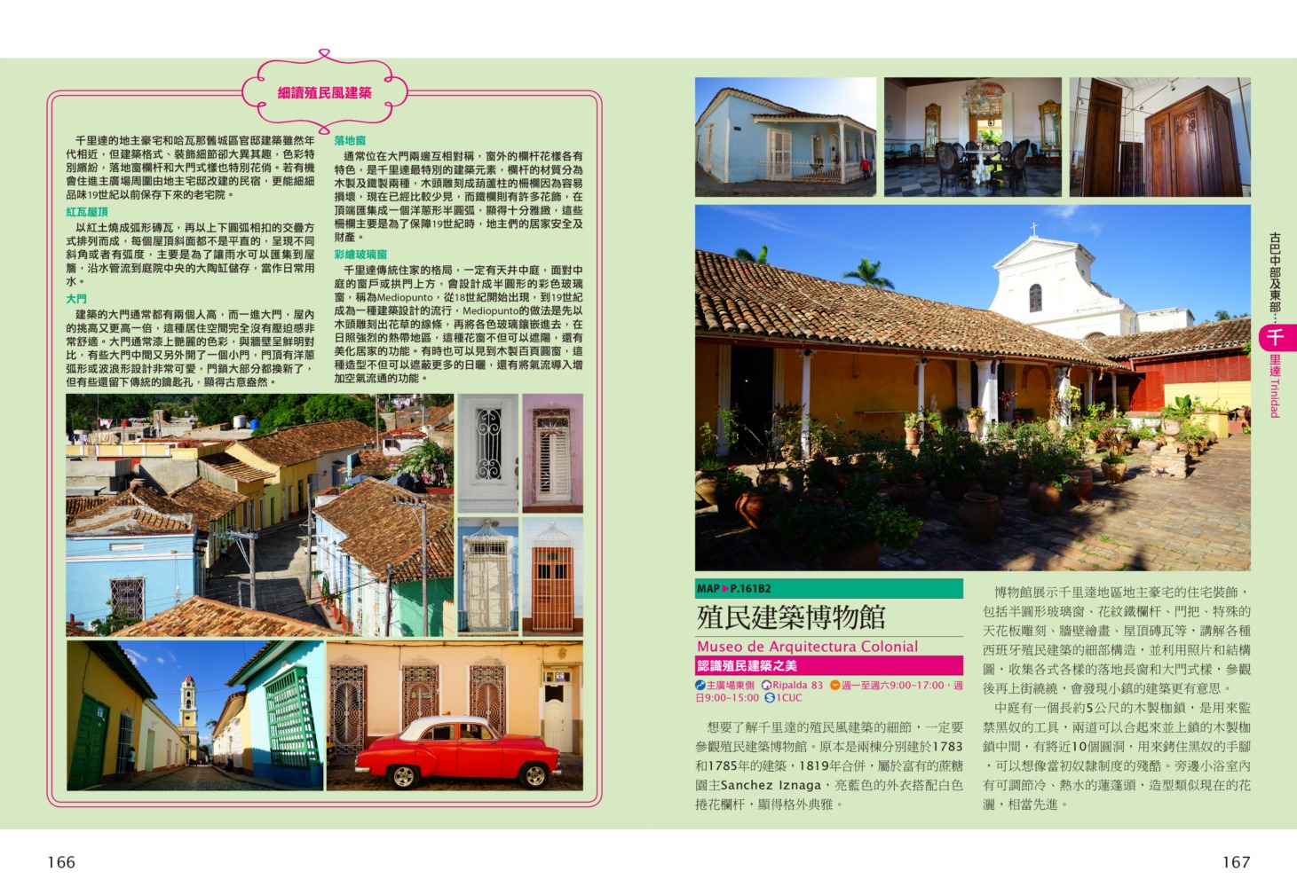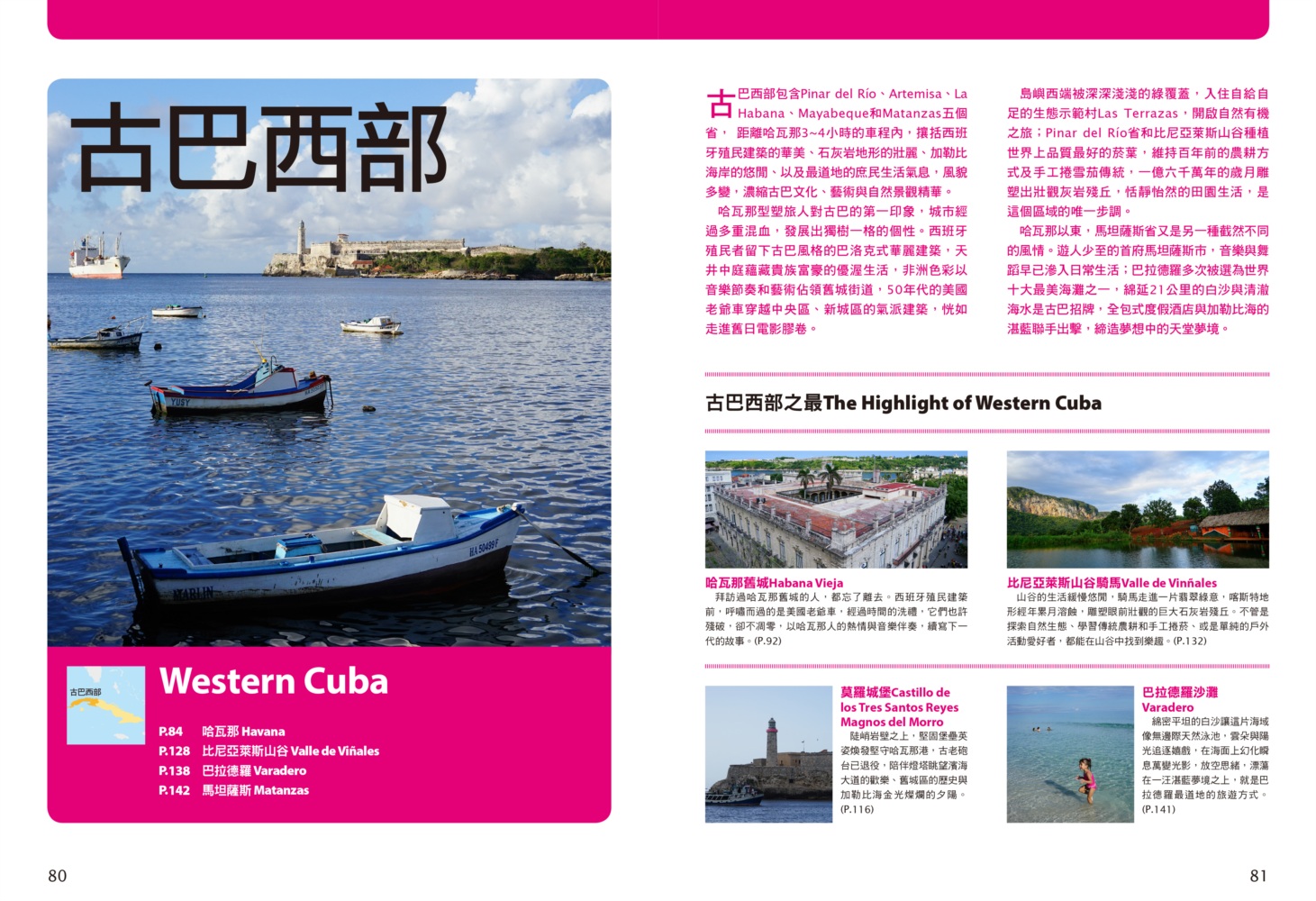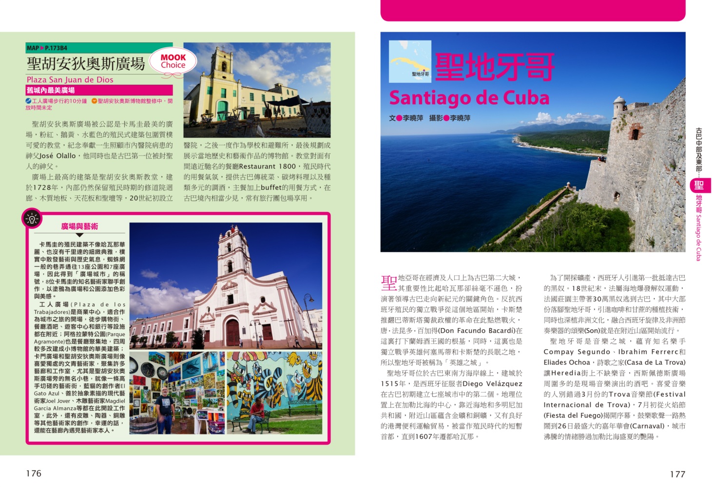 P.006 歡迎來到古巴Welcome to Cuba P.008 古巴全圖Map of Cuba P.011 旅行計畫Plan Your Trip P.012 古巴之最Top Highlights of Cuba P.022 古巴精選行程Top Itineraries of Cuba P.024 最佳旅行時刻When to go P.026 古巴好味Best Taste in Cuba P.028 古巴好買Best Buy in Cuba P.030 古巴交通攻略Transportation in Cuba P.035 古巴百科Cuba Encyclopedia P.036 古巴簡史History of Cuba P.038 世界遺產World Heritages of Cuba P.041 蔗糖與蘭姆酒Sugar cane & Rum P.048 菸草與雪茄Tabaco P.053 音樂與舞蹈Music & Dance P.060 當一天拉風老爺Vintage Car P.065 這裏是古巴!This is Cuba P.079 分區導覽Area Guide P.080 古巴西部Western Cuba P.082 如何玩古巴西部各地How to Explore Western Cuba P.084 哈瓦那La Habana 教堂廣場、哈瓦那大教堂、隆畢優官邸&阿科斯侯爵官邸、殖民時期工藝博物館、衛弗列多‧藍藝術中心、軍事廣場、市立博物館、塞昆多卡布官邸、皇軍城堡、小神殿、Farmacia Taquechel傳統藥局、主教街、商人街、聖芳濟廣場、聖芳濟大教堂、蘭姆酒博物館、Casa de Carmen Montilla 藝廊、哈瓦那全景館、古巴攝影博物館、紙牌博物館、哈瓦那歌劇院、舊國會大廈、中央公園、普拉多大道、革命博物館、國立貝拉斯美術館、聖薩爾瓦多·德拉蓬塔城堡、馬雷貢濱海大道、帕塔加斯雪茄工廠、華人街、哥倫布公墓、何塞・馬蒂紀念塔、革命廣場、哈瓦那大學、弗斯特之家、卡巴那城堡、莫羅城堡、兩個世界飯店、維吉亞山莊、柯西瑪漁村、柏迪奇達酒吧、佛羅里達酒吧、吃住買在哈瓦那、博物館潛規則、伊莎貝拉夫人、廢墟裡的哈瓦那人、芭蕾教母阿隆索 P.123 比尼亞萊斯山谷Valle de Viñales 比尼亞萊斯市區、La Casa del Veguero菸草農莊、茉莉花飯店、印第安岩洞、史前壁畫、聖米格爾洞、來去鄉下住一晚、古巴牛仔山野行、綠色古巴-生態村與有機農耕P.132 巴拉德羅Varadero 安布羅西奧洞穴、市立博物館、強森公園、天堂海灘放空假期P.136 馬坦薩斯Matanzas 自由公園、加西亞鐵橋與維希亞廣場、聖卡洛斯保羅麥歐大教堂、消防博物館、蒙賽拉特教堂 P.140 古巴中部及東部Central and Eastern Cuba P.142 如何玩古巴中部及東部各地How to Explore Western Cuba P.144 聖克拉拉Santa Clara 切・格瓦拉紀念碑、維達爾公園、仁慈劇院、裝飾藝術博物館、城市之家、康士坦丁諾菸草工廠、革命主題咖啡館、裝甲火車紀念公園、卡比羅山丘 P.150 西恩富戈斯Cienfuegos 何塞‧馬蒂公園、托馬斯特里劇院、文化之家、巴列宮 P.154 千里達Trinidad 主廣場、音樂之家、浪漫博物館、殖民建築博物館、城市歷史博物館、聖德利亞儀式之屋、戰爭博物館、陶器工作坊、甘蔗谷的繁榮與黑暗、Canchánchara、細讀殖民風建築、鼓聲與吟唱、千里達好味 P.165 卡馬圭 Camagüey 阿格拉蒙特之家、城市模型館、多元文化博物館、卡門廣場、聖胡安狄奧斯廣場、水缸之城、廣場與藝術 P.170 聖地牙哥Santiago de Cuba 狄亞哥維拉奎斯故居、西斯佩德斯廣場、聖母升天大教堂、詩歌之家、嘉年華博物館、荷西馬利之家、依莎貝利卡咖啡館、蘭姆酒博物館、百加得博物館、秘密抗爭博物館、蒙卡達軍營、聖伊菲熱尼亞墓園、莫羅城堡、山丘上的黑色聖女、尋找聖地牙哥最美視角、樂士浮生錄與不朽樂手、王者與蝙蝠的蘭姆酒、關達那美拉 P.184 巴拉柯阿Baracoa 可可之家、考古博物館、亞松森聖母大教堂、亞歷杭德羅‧德洪堡國家公園、巴拉科阿戶外旅程 P.188 聰明旅行家The Savvy Traveler