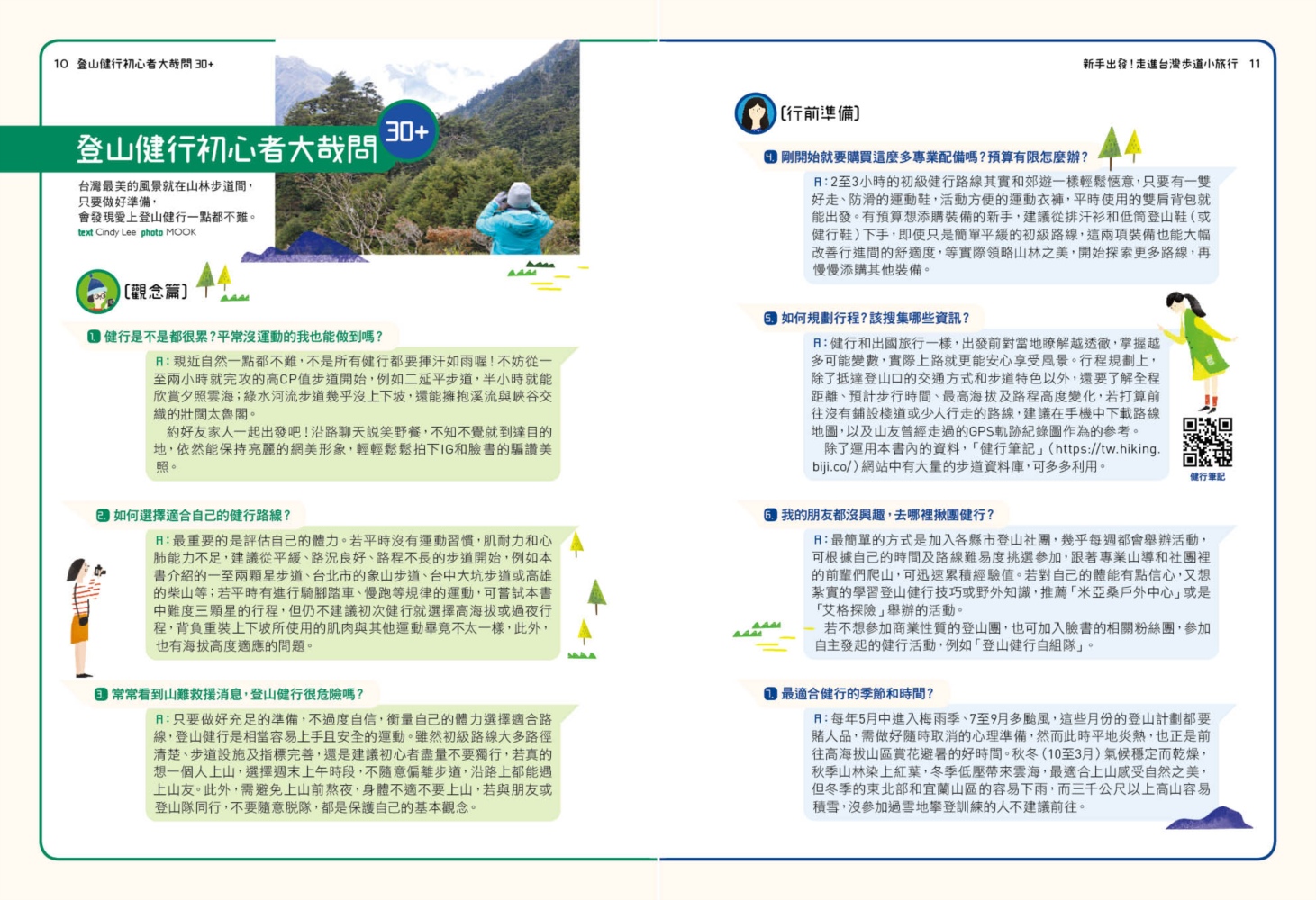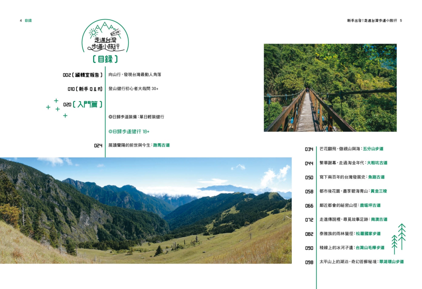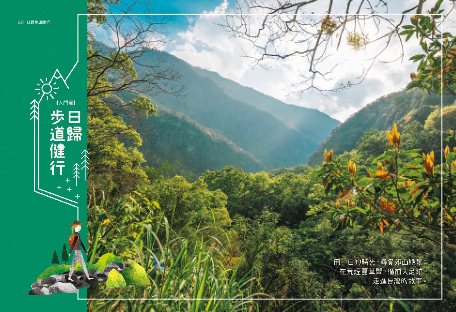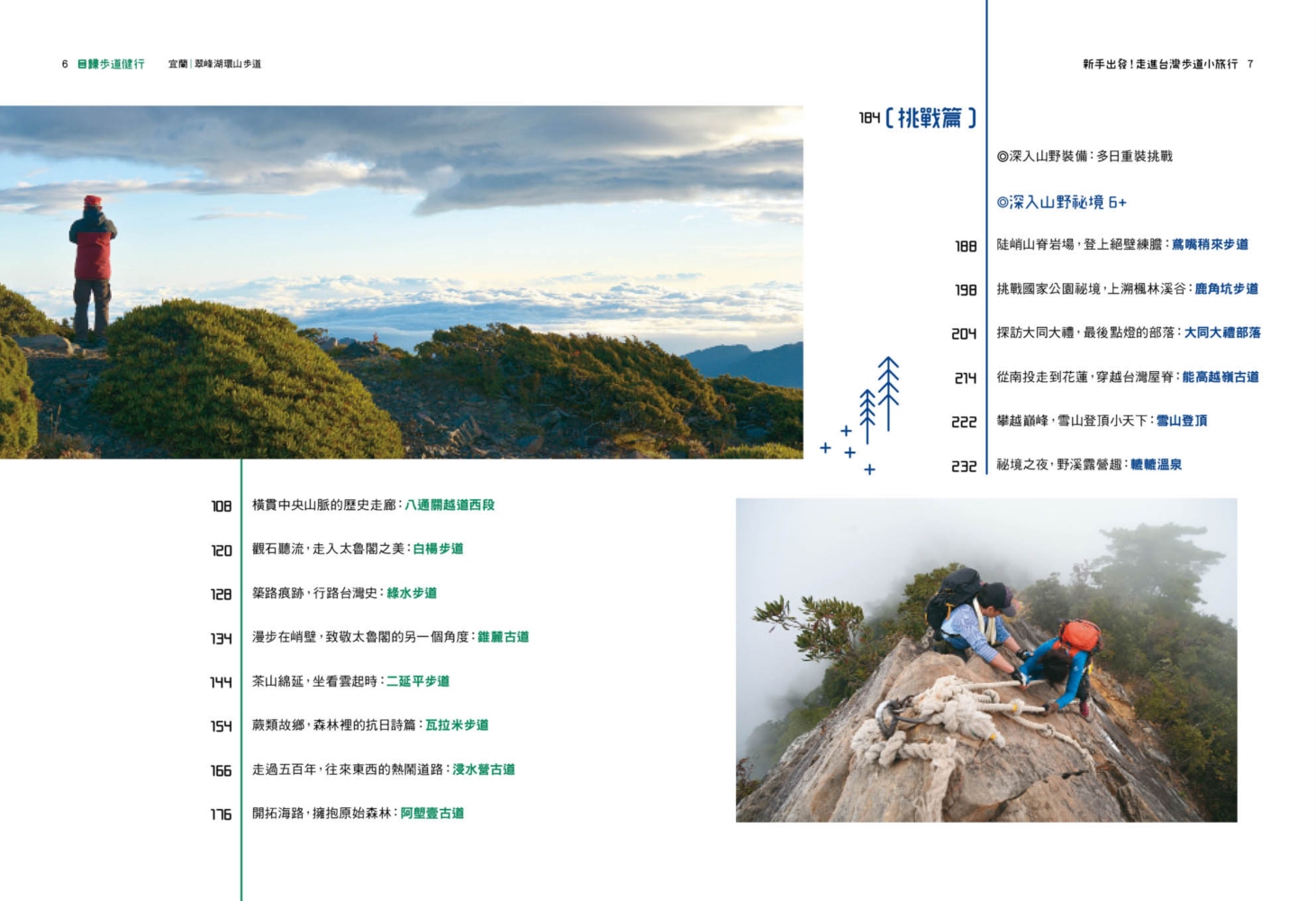 【編輯室報告】向山行,發現台灣最動人角落 【新手Q & A】登山健行初心者大哉問30+ 【入門篇】 ◎日歸步道裝備:單日輕裝健行 ◎日歸步道健行18+ 展讀蘭陽的前世與今生:跑馬古道 芒花翻飛,傲視山與海:五分山步道 繁華謝幕,走過淘金年代:大粗坑古道 寫下兩百年的台灣發展史:魚路古道 都市後花園,盡享碧海青山:黃金三稜 鄰近都會的祕密山徑:鹿堀坪古道 走進傳說裡,尋覓故事足跡:南澳古道 泰雅族的雨林獵徑:松羅國家步道 稜線上的冰河孑遺:台灣山毛櫸步道 太平山上的湖泊,奇幻蘚苔祕境:翠峰湖環山步道 橫貫中央山脈的歷史走廊:八通關越道西段 觀石聽流,走入太魯閣之美:白楊步道 築路痕跡,行路台灣史:綠水步道 漫步在峭壁,致敬太魯閣的另一個角度:錐麓古道 茶山綿延,坐看雲起時:二延平步道 蕨類故鄉,森林裡的抗日詩篇:瓦拉米步道 走過五百年,往來東西的熱鬧道路:浸水營古道 開拓海路,擁抱原始森林:阿塱壹古道 【挑戰篇】 ◎深入山野裝備:多日重裝挑戰 ◎深入山野祕境6+ 陡峭山脊岩場,登上絕壁練膽:鳶嘴稍來步道 挑戰國家公園祕境,上溯楓林溪谷:鹿角坑步道 探訪大同大禮,最後點燈的部落:大同大禮部落 從南投走到花蓮,穿越台灣屋脊:能高越嶺古道 攀越巔峰,雪山登頂小天下:雪山登頂 祕境之夜,野溪露營趣:轆轆溫泉