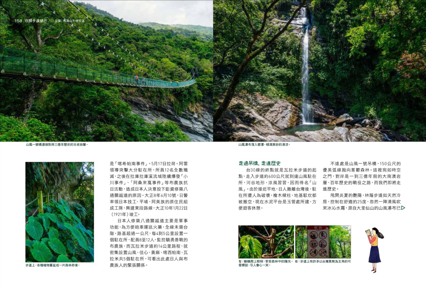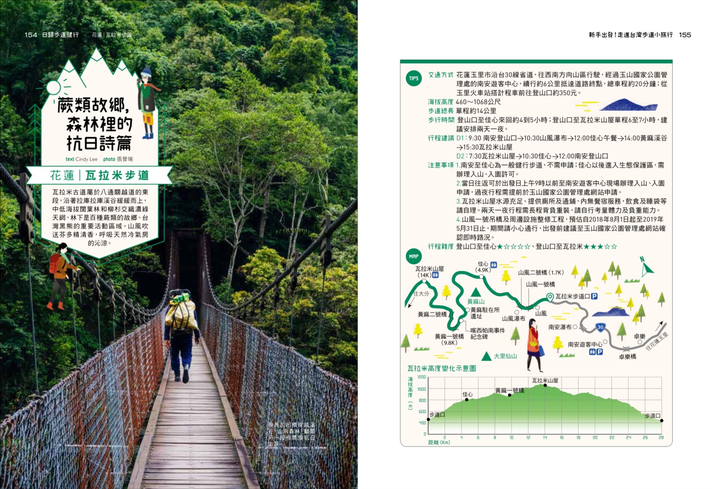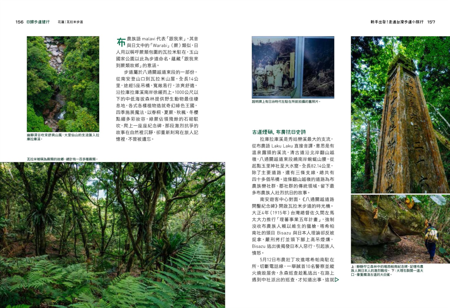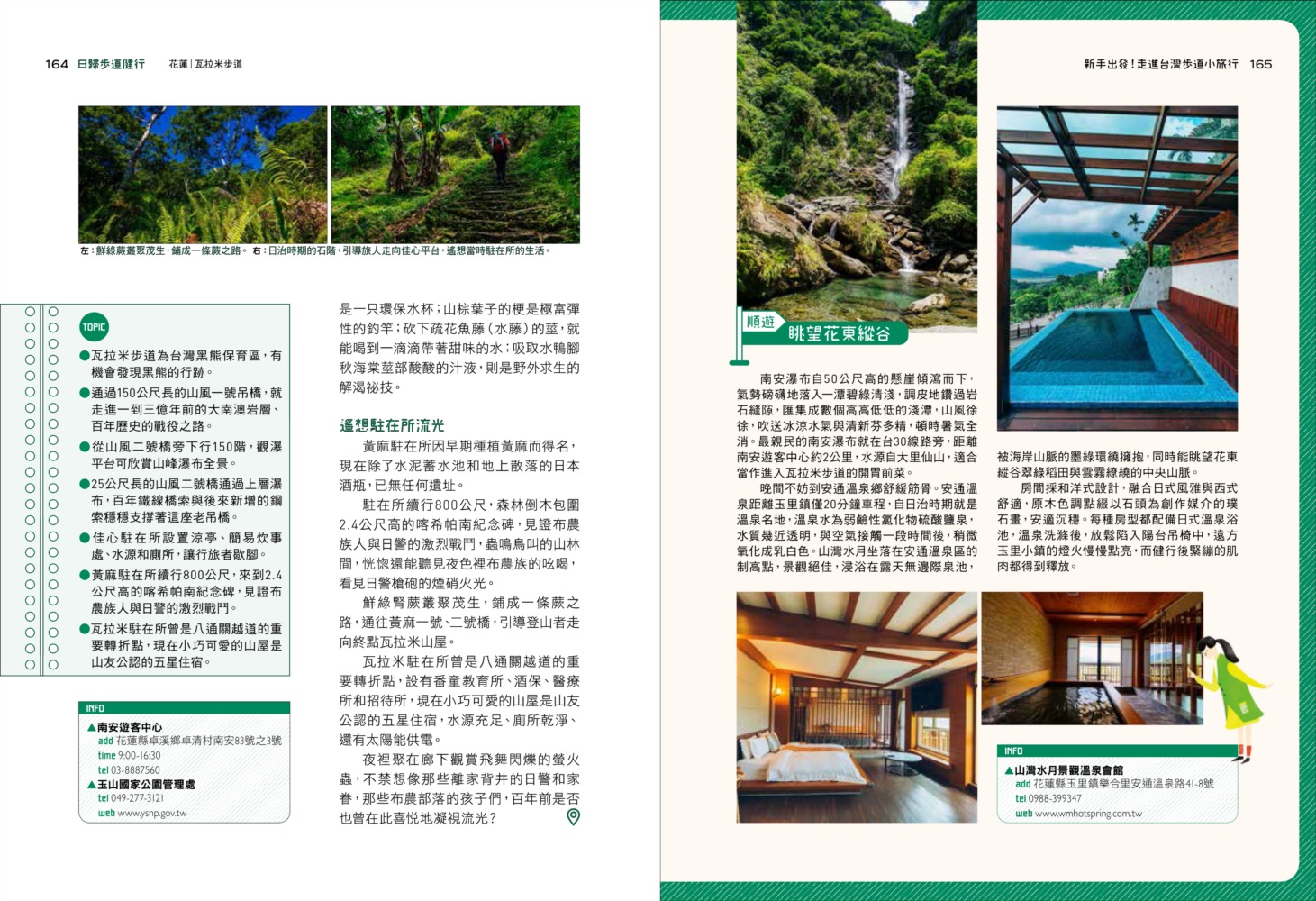 【編輯室報告】向山行,發現台灣最動人角落 【新手Q & A】登山健行初心者大哉問30+ 【入門篇】 ◎日歸步道裝備:單日輕裝健行 ◎日歸步道健行18+ 展讀蘭陽的前世與今生:跑馬古道 芒花翻飛,傲視山與海:五分山步道 繁華謝幕,走過淘金年代:大粗坑古道 寫下兩百年的台灣發展史:魚路古道 都市後花園,盡享碧海青山:黃金三稜 鄰近都會的祕密山徑:鹿堀坪古道 走進傳說裡,尋覓故事足跡:南澳古道 泰雅族的雨林獵徑:松羅國家步道 稜線上的冰河孑遺:台灣山毛櫸步道 太平山上的湖泊,奇幻蘚苔祕境:翠峰湖環山步道 橫貫中央山脈的歷史走廊:八通關越道西段 觀石聽流,走入太魯閣之美:白楊步道 築路痕跡,行路台灣史:綠水步道 漫步在峭壁,致敬太魯閣的另一個角度:錐麓古道 茶山綿延,坐看雲起時:二延平步道 蕨類故鄉,森林裡的抗日詩篇:瓦拉米步道 走過五百年,往來東西的熱鬧道路:浸水營古道 開拓海路,擁抱原始森林:阿塱壹古道 【挑戰篇】 ◎深入山野裝備:多日重裝挑戰 ◎深入山野祕境6+ 陡峭山脊岩場,登上絕壁練膽:鳶嘴稍來步道 挑戰國家公園祕境,上溯楓林溪谷:鹿角坑步道 探訪大同大禮,最後點燈的部落:大同大禮部落 從南投走到花蓮,穿越台灣屋脊:能高越嶺古道 攀越巔峰,雪山登頂小天下:雪山登頂 祕境之夜,野溪露營趣:轆轆溫泉