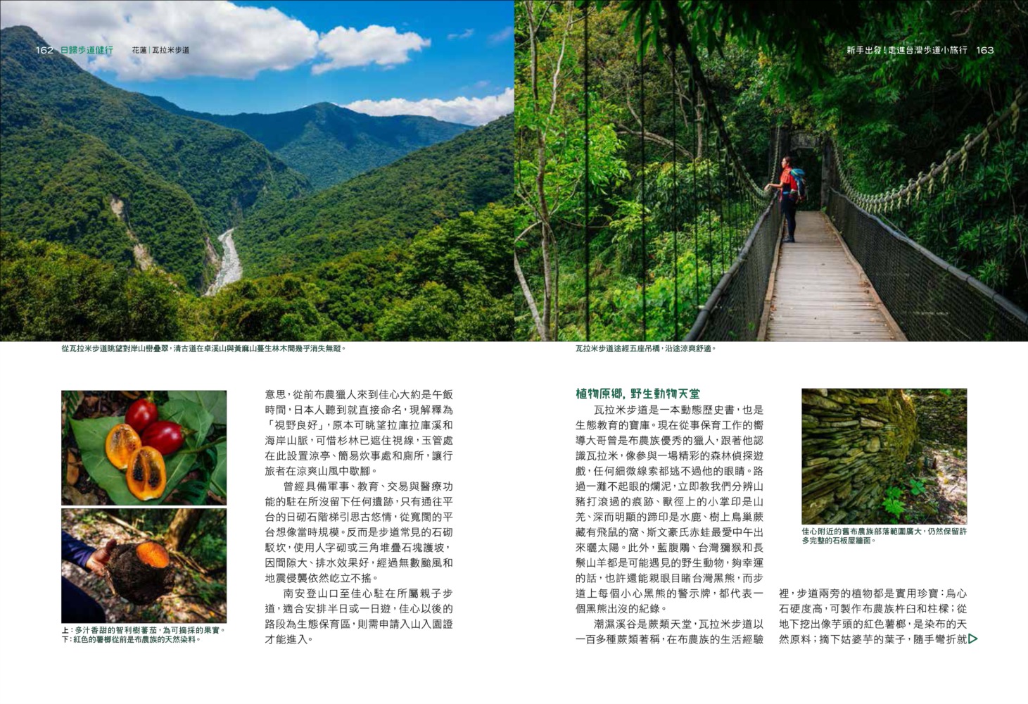 和初心者站在同一陣線,我們實際走訪每一條步道, 從此愛上登山健行,因為台灣最美的風景就在山林步道間! 新手也能現在就出發,輕輕鬆鬆拍下按讚美照,走出不一樣的台灣行旅。 從低海拔闊葉林、高海拔針葉林到高山草原,台灣山林風貌萬千,蘊藏豐富的自然資源及人文歷史遺跡,除了國內登山愛好者,每年也吸引無數國外旅客慕名而至。 開啟台灣山野之門,才能真正認識島嶼之美,本書精選分佈全台的24條步道,匯集山野專家提點的注意事項,深入步道的歷史故事和自然生態,以新手的標準提供建議步行時間和行程難度。 從簡單到進階,從「日歸步道」出發,循序漸進邁向「山野祕境」,無論新手或老手都能走出屬於自己的山之道。 走進山野步道,發現土地與先民的故事, 在流泉綠意中深呼吸,愛上步道健行。 【入門篇】日歸步道健行 用一日的時光,尋覓郊山絕景;在荒煙蔓草間,循前人足跡,走進台灣的故事。 【挑戰篇】深入山野祕境 深入人跡罕至的山林,發掘獨一無二的美景,盡情享受踏出第一步的悸動。 【本書特色】 ◎深入介紹步道自然生態及人文故事,增加路程的豐富度。 ◎新手Q & A解答新手步道登山可能遇到的問題。 ◎介紹健行及登山裝備,讓人能做好事前準備。 ◎提供步道路線圖和海拔高度圖,能更快掌握步道狀況。 ◎搭配步道情報如交通方式、步道總長、步行時間等,提供行程建議、適合季節及注意事項甚至周邊順遊,讓規劃行程更便利。 ◎條列每條路線不可錯過的特色看點。 ◎推薦步道順遊景點、美食或飯店,舒緩登山健行後的疲憊。