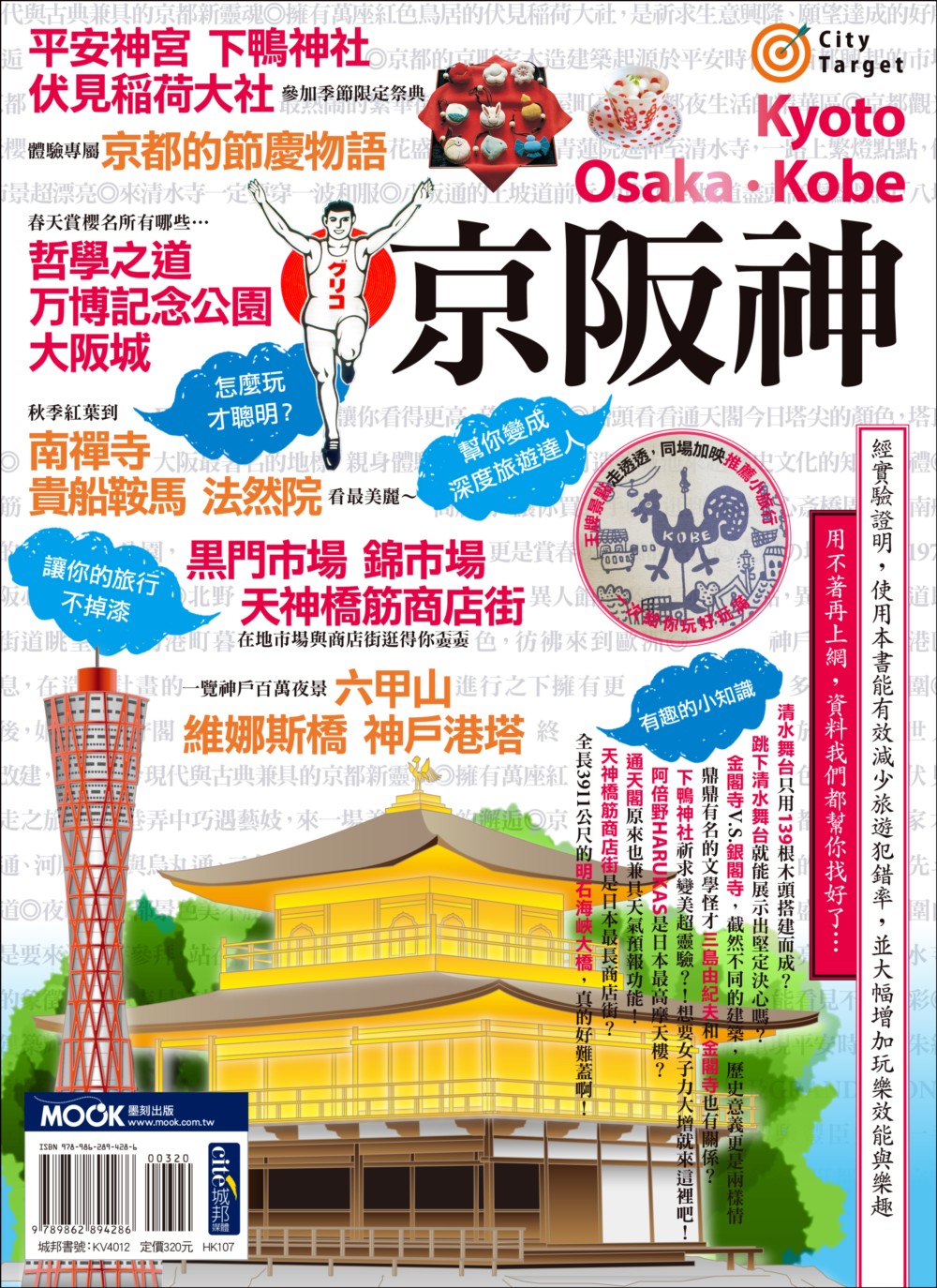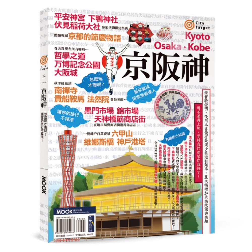 關西地區必玩三大天王-《京阪神》 古典優雅的-京都 熱情豪邁的-大阪 復古洋風的-神戶 更直接點聯想… 京都=古寺 大阪=美食 神戶=海港 但,京阪神不止如此… 【去京都前你知道這些嗎?】 ●你查得到賞春櫻要到大阪城,看楓葉要去清水寺,但你知道原來只有用139根木頭就搭建起清水舞台嗎? ●自古流傳跳下清水舞台就能展示堅毅決心? ●京都有金閣寺,當然也有銀閣寺,兩座截然不同的建築,歷史意義更是兩樣情? ●女生想要變美、有魅力?走趟下鴨神社一起吸飽女子力能量! 【大阪吃飽、逛滿,還有這些呢!】 ●阿倍野HARUKAS可是日本第一最高摩天樓! ●大阪精神-通天閣原來也兼具天氣預報功能? ●大阪城周邊的天神橋筋商店街是日本最長商店街? ●万博記念公園裡的太陽の塔和漫畫《20世紀少年》有關係? 【充滿歐洲風情的神戶,值得期待…】 ●神戶人的神秘用語-用「上山下海」告訴你方位? ●全長3911公尺的跨海大橋明石海峽大橋,真的好難蓋啊! ●名列日本三大名城之一的姫路城,為何又稱白鷺城? ●神戶港、六甲山、維娜斯橋,名列神戶最佳夜景地點! 【小特企1:京都世界遺產地圖】 日本千年古都:京都,連當地人都以身為京都人為傲,在1994年當地的多所古蹟列為世界遺產,跟著世遺地圖一覽千年古都的絕代風華。 【小特企2:漫遊優雅京阪神,沉浸舊屋時光】 如果你憧憬著舊建築優雅迷人的風韻,嚮往著老屋帶來風味盎然的典雅生活,請跟著我們的腳步,來趟最浪漫的京阪神舊屋迷走之旅。 【出走京阪神,開始一趟近郊小旅行】 ●「福知山」是前往天橋立的必經之地,騎上單車體驗半日的悠閒鄉間風光。 ●從神戶出發30分鐘就能抵達「有馬溫泉」,輕鬆展開一泊二日的古老溫泉行。 ●走遠一點,到「奈良公園」與小鹿們度過一個瘋狂又爆笑的古都旅程。 【PLUS!更多旅遊小知識】 ●超實用的小提醒:像是搭車該怎麼買票最划算、怎樣可以在參觀景點時節省預算…讓你花錢花在刀口,旅遊大省荷包笑呵呵。 ●超詳盡的景點解析:除了介紹哪裡有好玩的地方、該怎麼去、價錢時間等資訊外,還會深入解說各景點的背景典故、不能錯過的重點與如何玩才聰明等,讓你玩得知其所以,開開心心長知識。 ●介紹的餐廳與店家都是超高人氣:而且為了怕你不知如何點菜,我們特別標註招牌菜和價錢,笑著跟選擇困難症說掰掰。 ●超精實的地圖描繪:讓你出門在外按圖索驥不再迷路。 ●超清楚的重點整理:有時間的細細研究,沒時間的直接看重點,這本書就是這麼貼心、這麼方便,值得你微笑擁有。