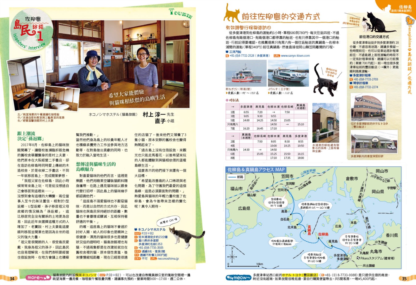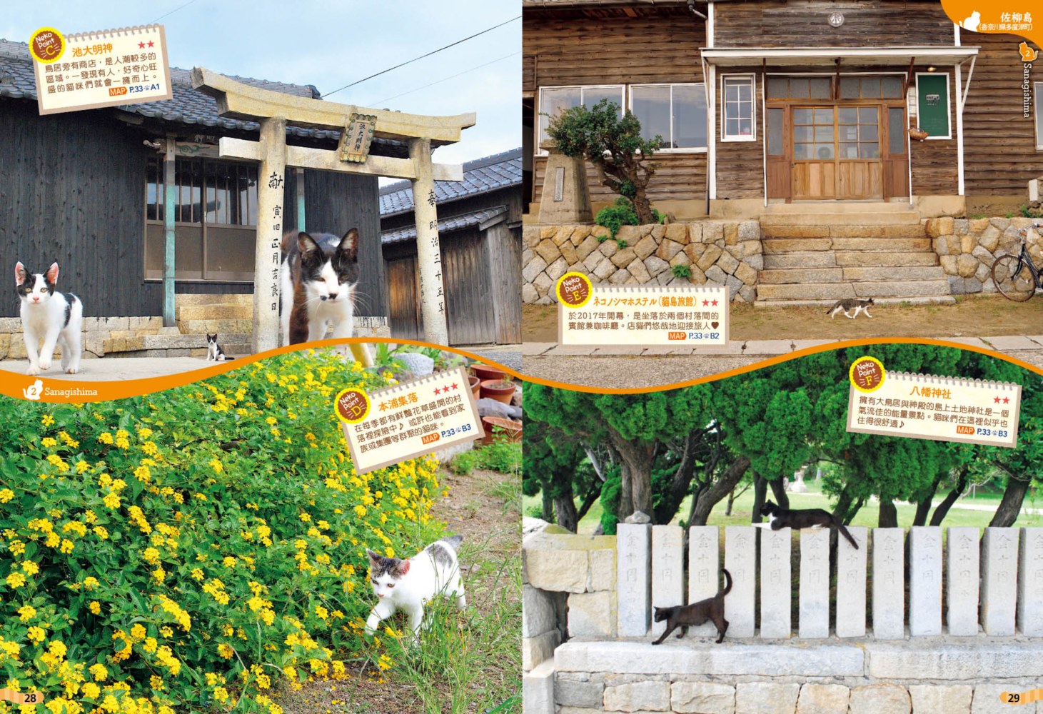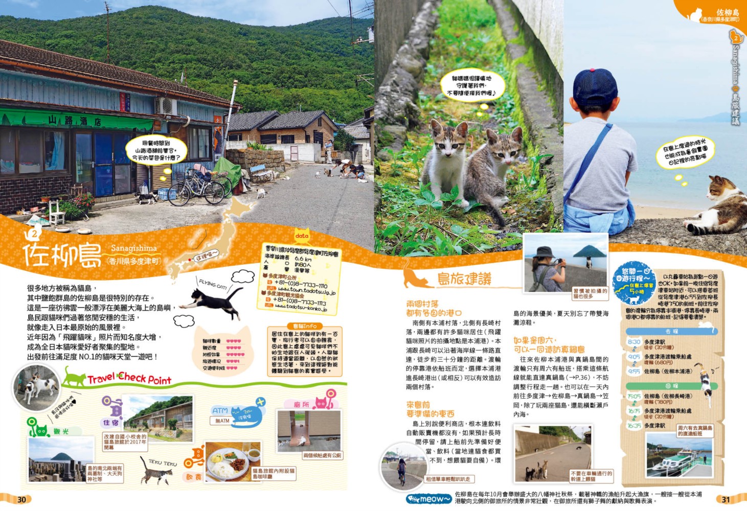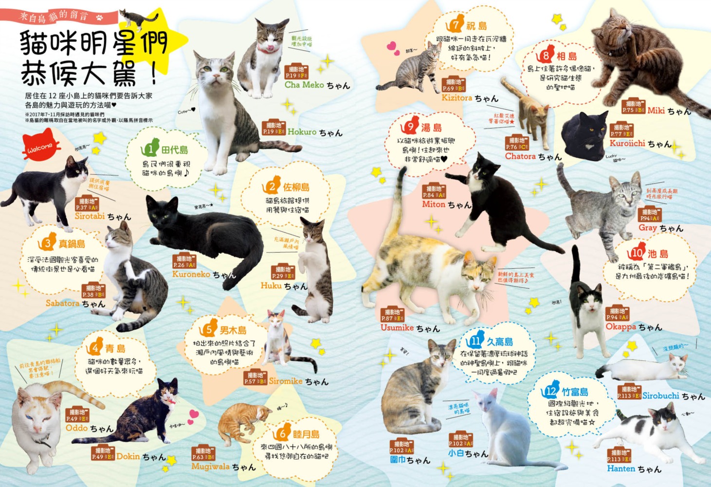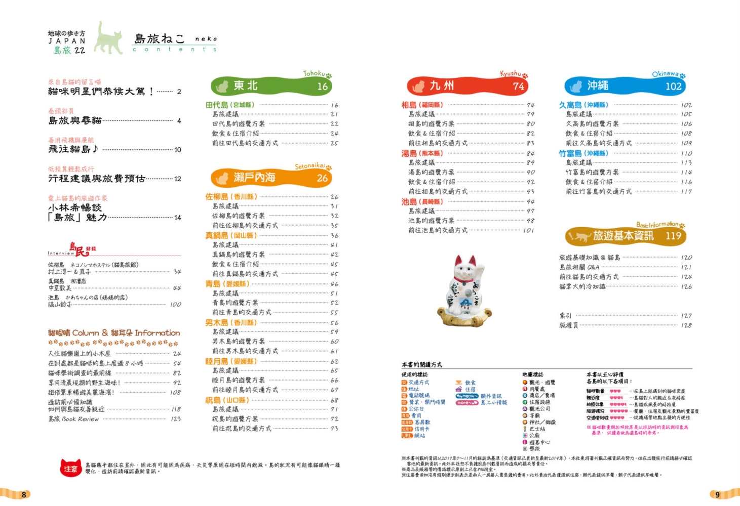 卷頭彩頁 •12座貓島的貓咪明星照 •島旅x貓咪 •善用飛機(含LCC)前往貓島 •低預算的貓島之行 •愛上貓島的旅遊作家──小林希 貓島專欄 •島上居民訪談 •入住田代島上的貓耳小屋 •在滿滿貓咪的青島上度過8小時 •貓咪學術調查的最前線──相島 •享用湯島當天現捕的美味海產 •租借單車暢遊久高島海濱 •如何親近島上的貓咪 •島旅Book Review 東北 瀨戶內海 九州 沖繩 旅遊基本情報 •貓島的基礎知識 •島旅know-how、Q&A •前往貓島的交通方式分析比較 •貓咪的基礎知識