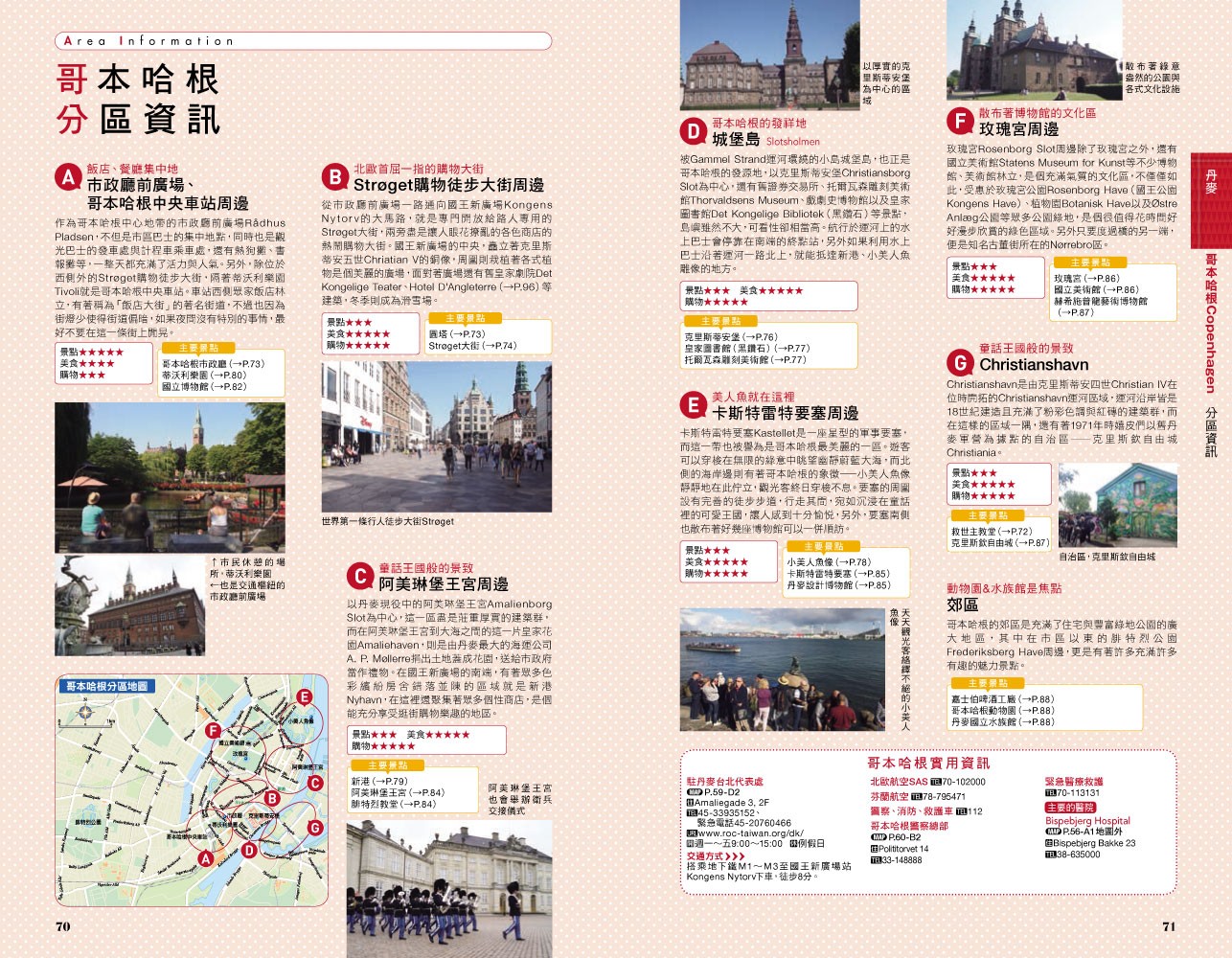 眺望宛如玩具屋般的市區景致! 72/Strøget購物徒步大街悠閒漫步 74/城堡島完全制霸! 76/追尋安徒生過往足跡78/開業177年!來去歷史悠久的蒂沃利樂園大玩特玩吧 80