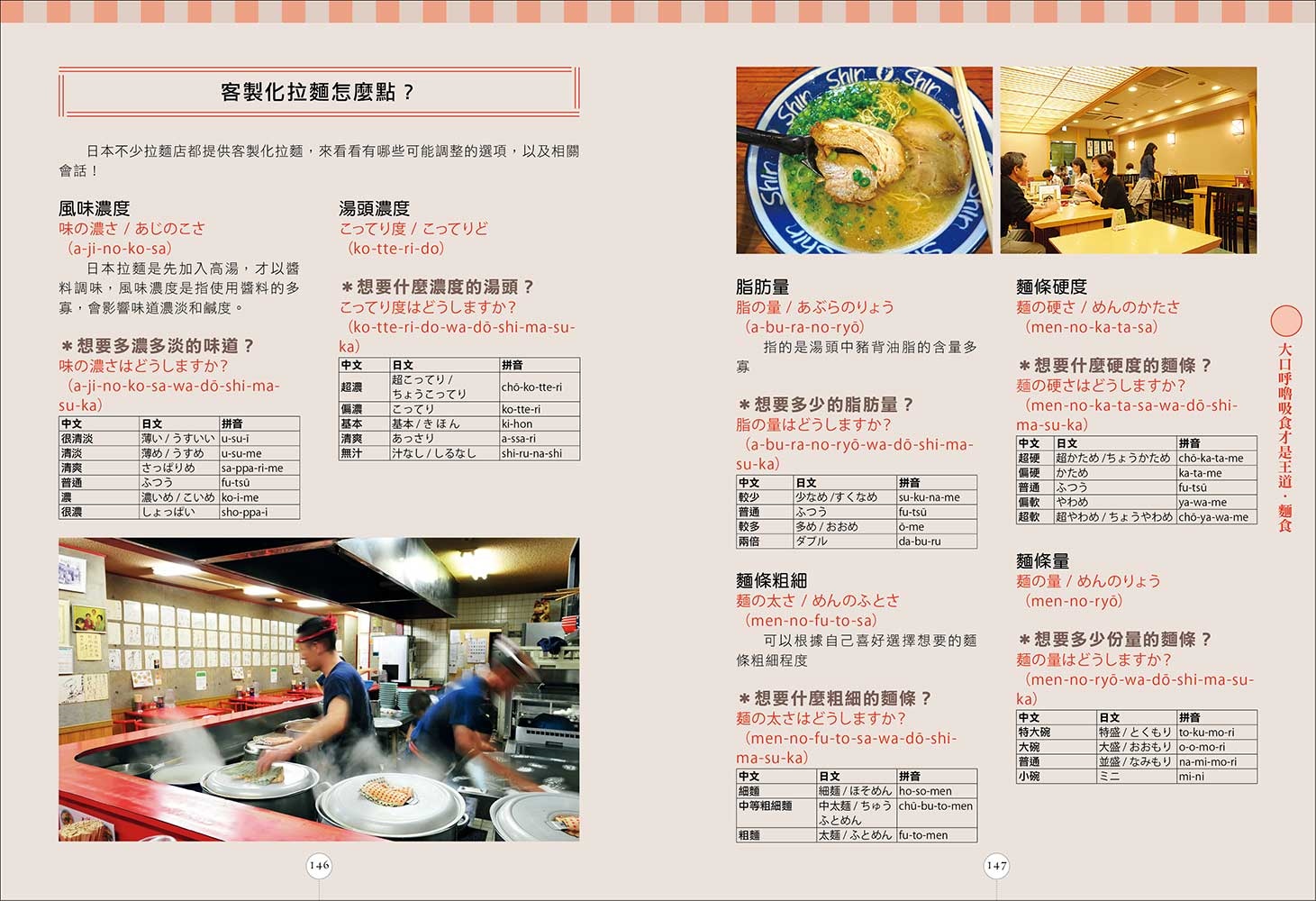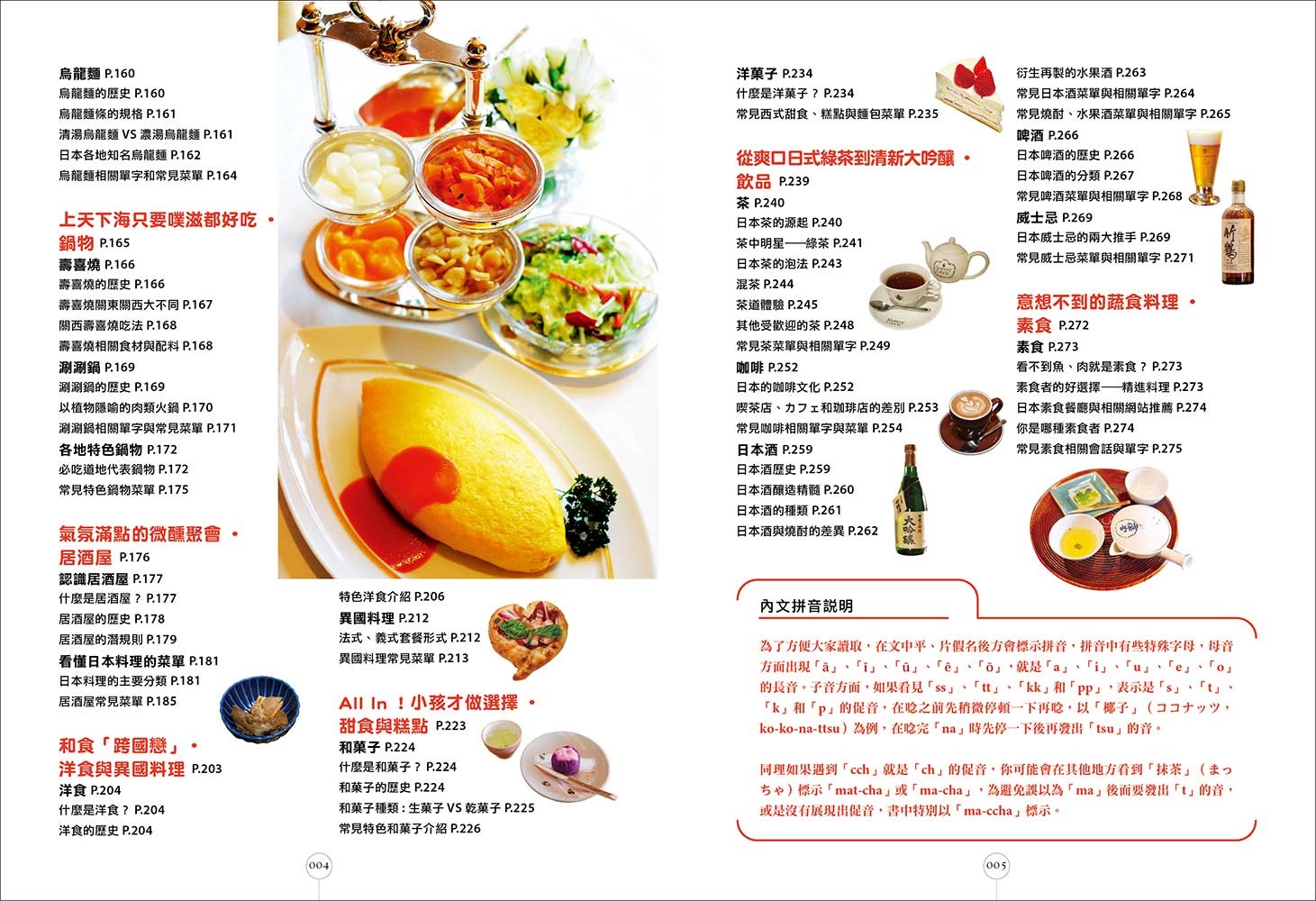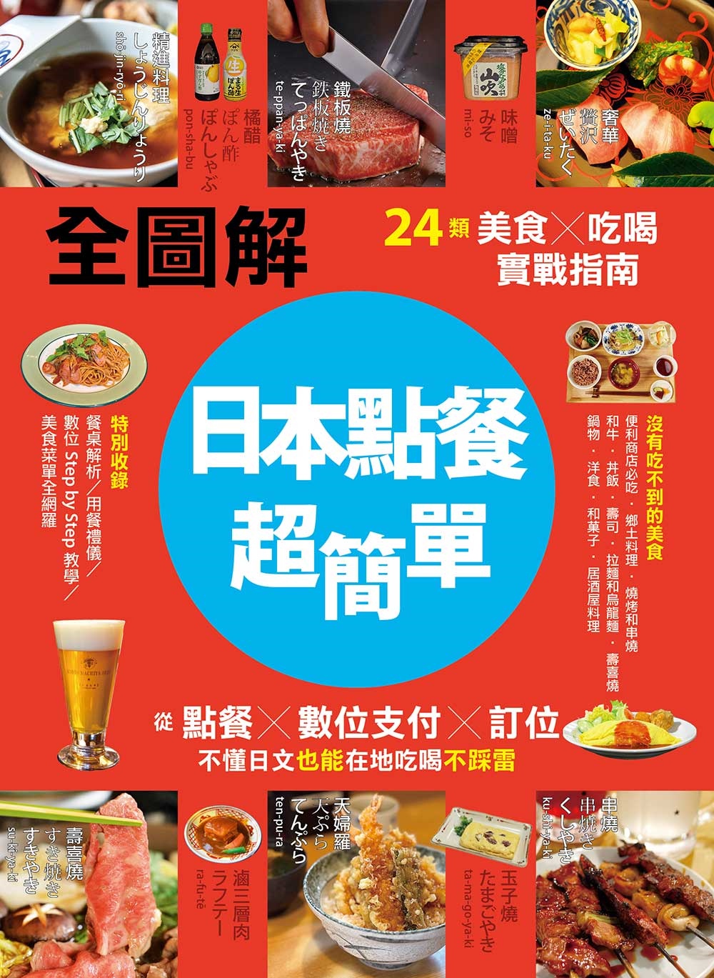現在只要透過這本書,就能讓你以圖解方式進出餐廳彷彿自家廚房,不必看圖說故事、不再需比手畫腳。透過實際採訪拍攝的圖片與文字介紹,同時附上中、日文對照名稱(與發音)或實用會話(日文),就算說不出口,也能輕鬆手指點餐!