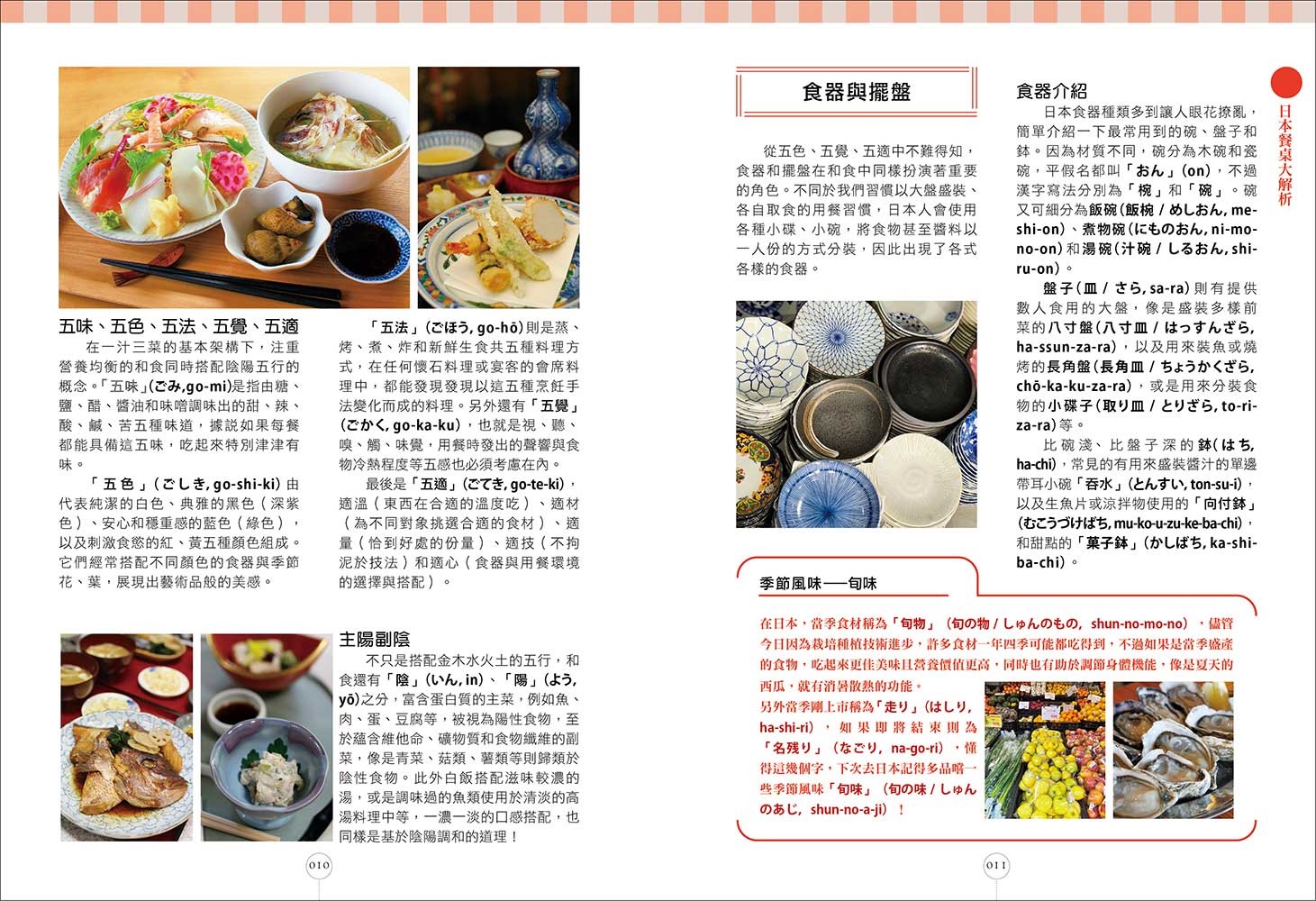 日本料理千變萬化、美味無窮,本書以文章搭配圖片方式,根據燒烤、米食、壽司、麵類、鍋物、居酒屋、洋食和異國料理、甜食與糕點、飲品、素食十大分類,帶你一一認識這些美食,文末並附上實用單字和會話,讓你從此點餐不卡卡,大快朵頣各類食物。