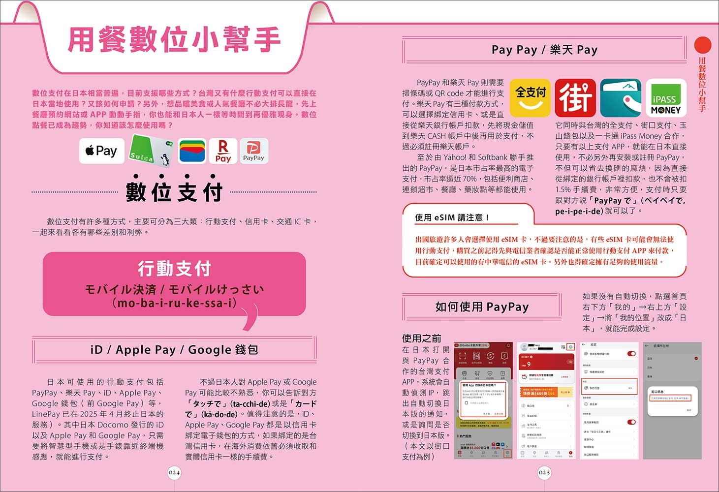 ‧數位支付:數位支付的便利讓人帶著手機出門就能消費,不必專程前往銀行兌換日幣,更省去收到一堆零錢的麻煩。在日本有哪些數位支付可以使用?又該如何使用?本書都有Step by Step的完整介紹。