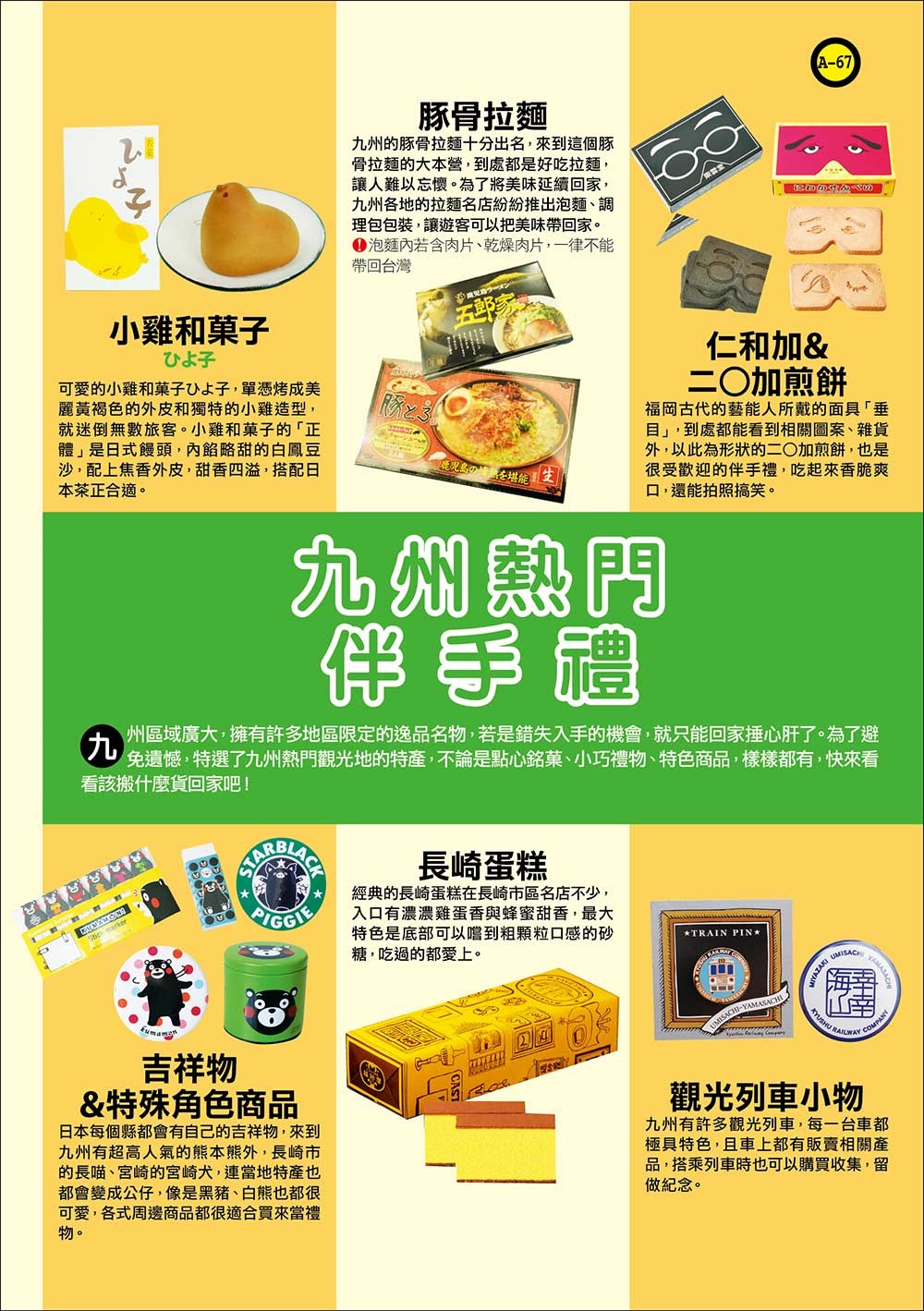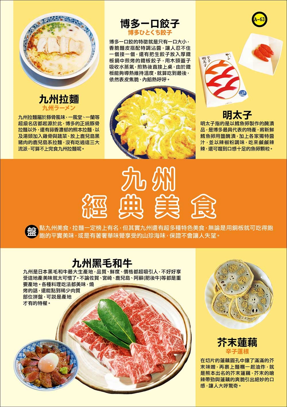 在九州該吃什麼?伴手禮該買什麼?別擔心,牛腸鍋、馬肉、豚骨拉麵、長崎什錦麵、焗烤咖哩,還有長崎蛋糕與各種點心和菓,經典的流行的、必吃必買的,通通都報你知。